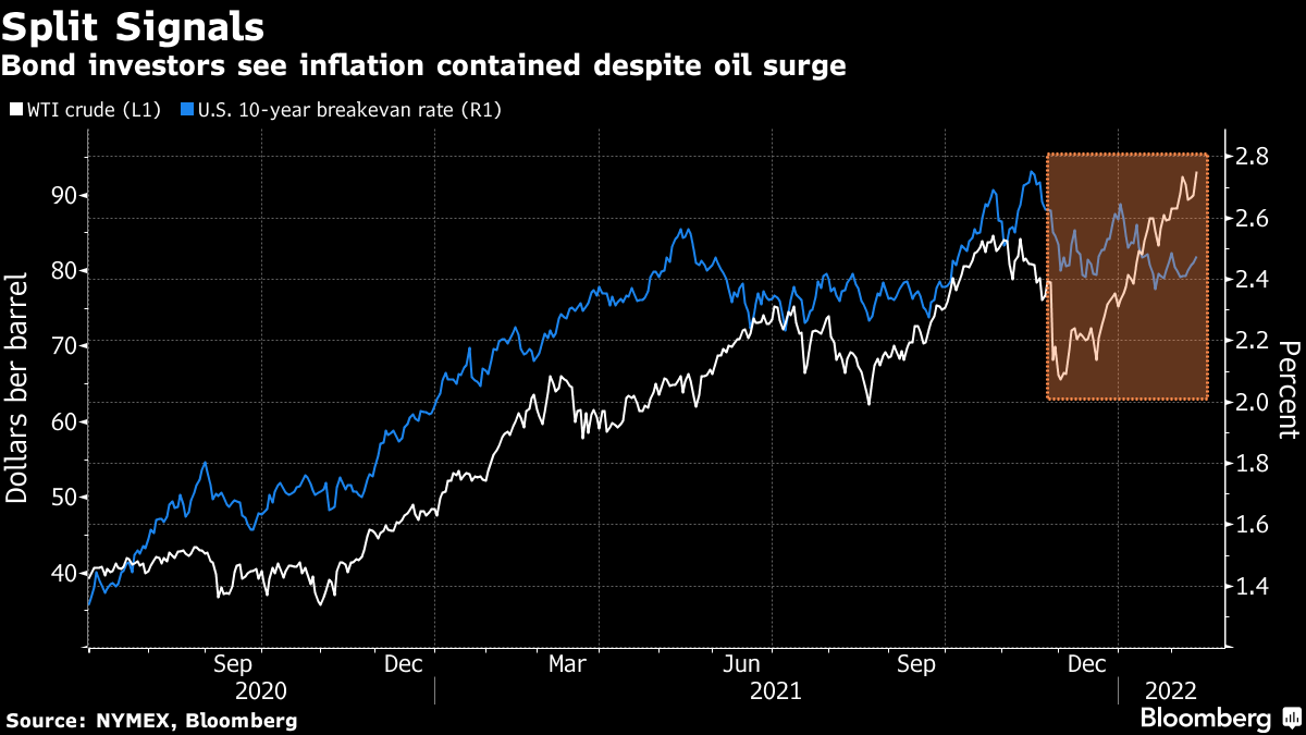 然而,债券市场仍然确信长期内通胀将保持在可控范围内。自11月份WTI在奥密克戎恐慌中大幅下跌以来,通胀预期与原油价格开始分道扬镳。即使WTI价格上涨超过25美元/桶,10年期通胀预期仍然保持稳定。也许投资者认为100美元/桶的价格再次是不可持续的。尽管在过去的五年中,原油价格曾达到三位数,但从未结束在这个水平以上。