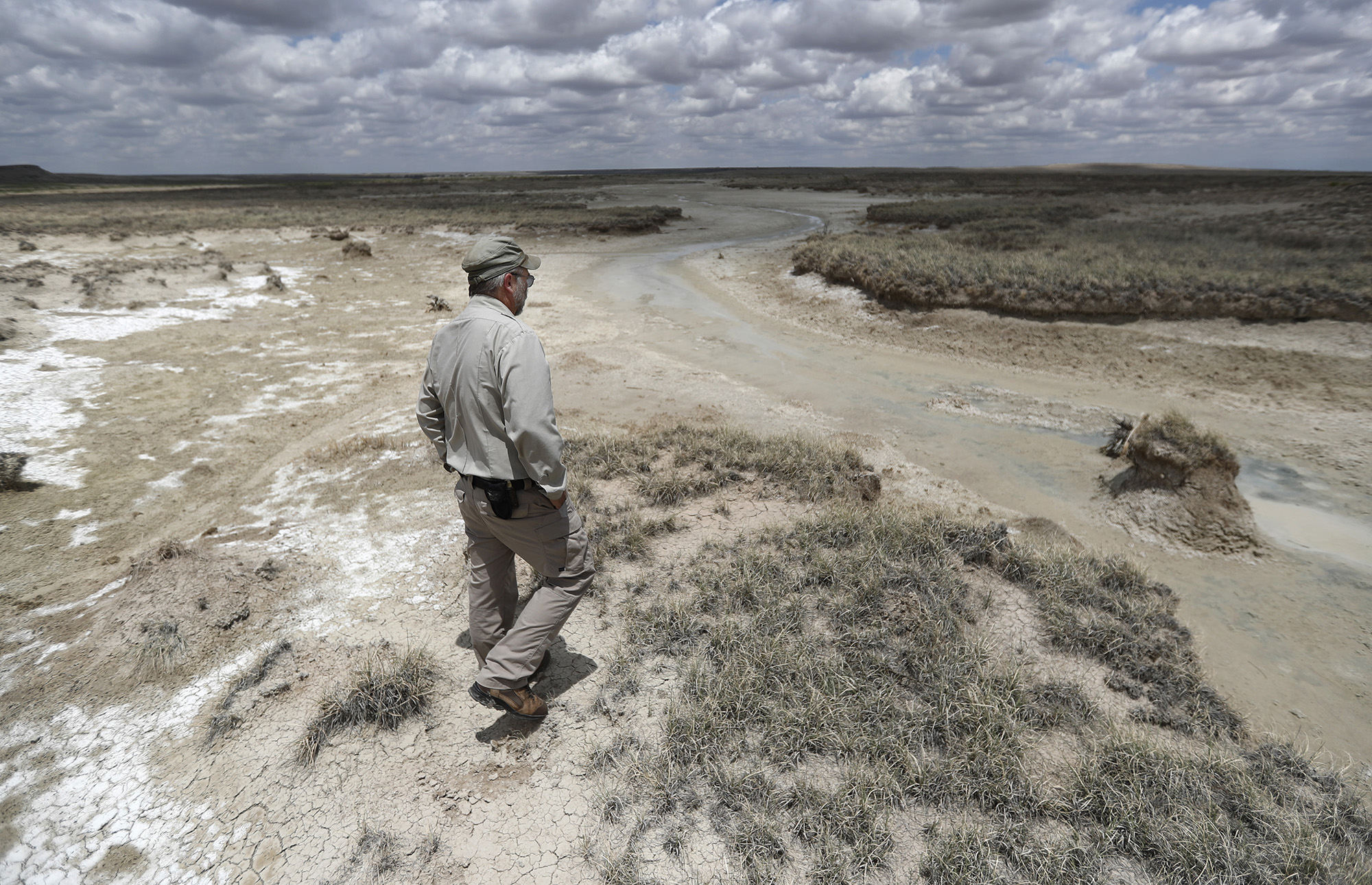 一位生物学家在2021年5月的德克萨斯州穆尔肖市外的穆尔肖国家野生动物保护区查看几乎干涸的泉水。摄影师:Mark Rogers/AP Photo