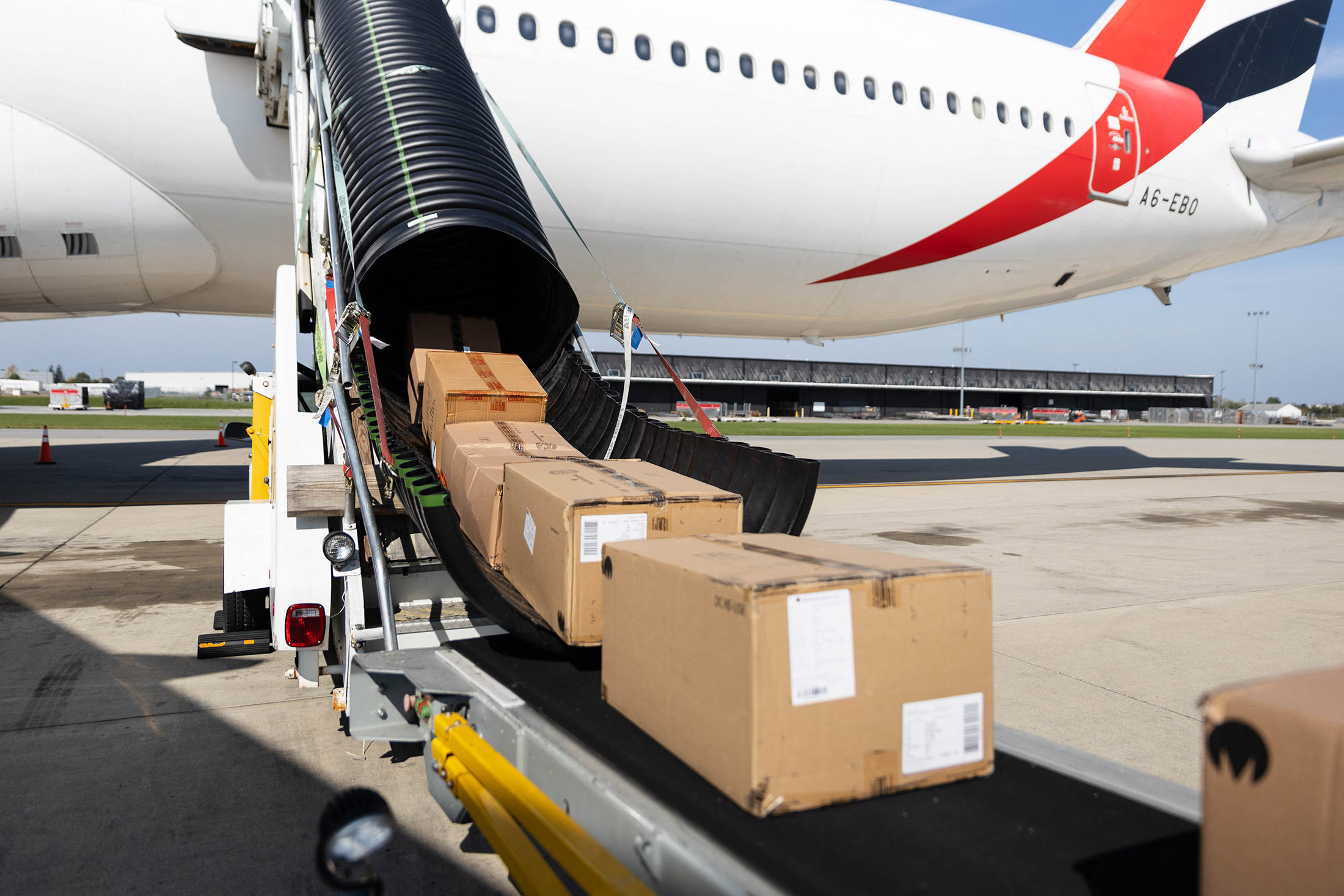 国际货物正在里肯贝克机场卸货。摄影师:梅根·杰林格/盖蒂图片社