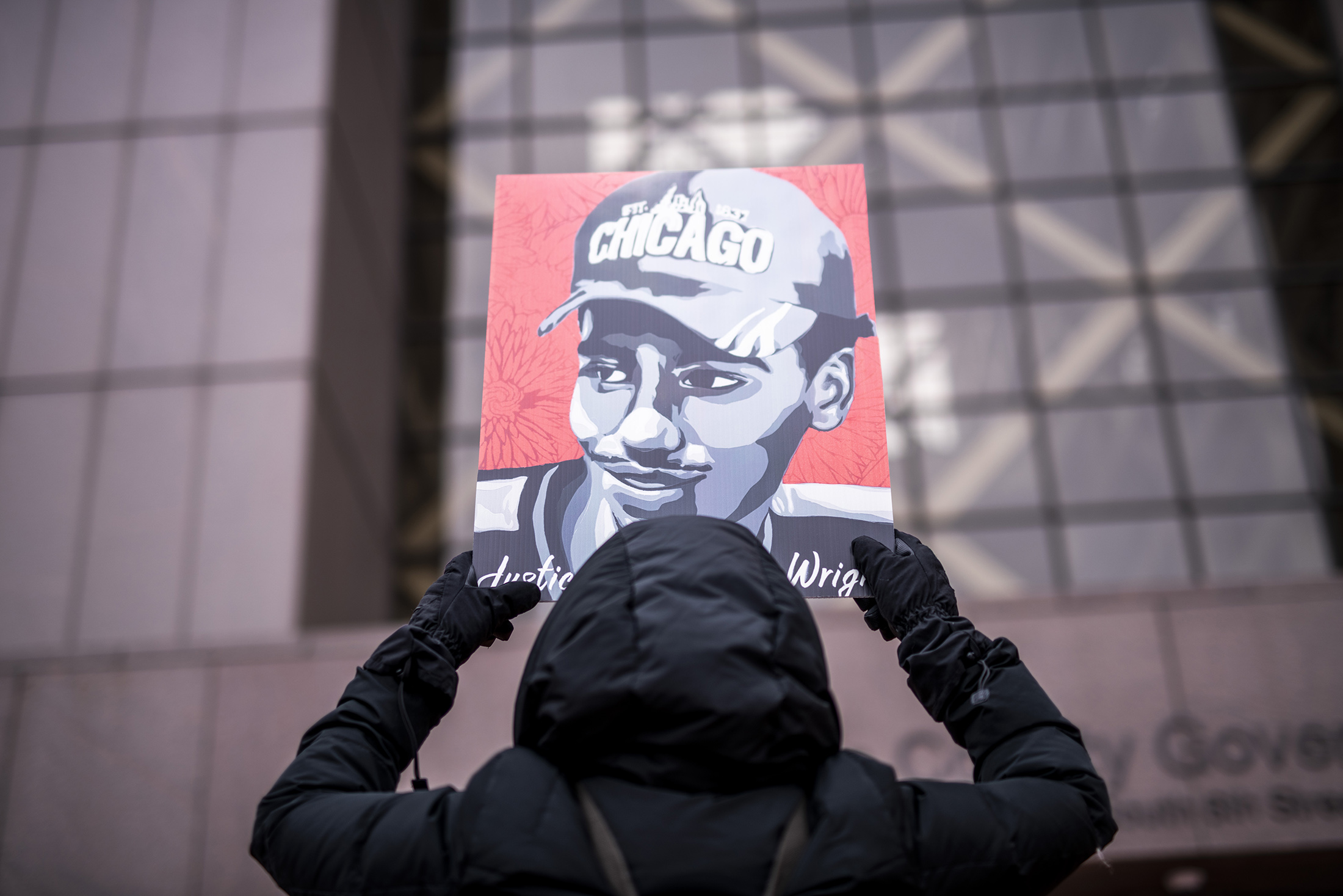 一名示威者在明尼阿波利斯明尼苏达州明尼阿波利斯市政府中心外举起了一幅代特·赖特的肖像,当时前警察金·波特在明尼阿波利斯市的判刑听证会上,发生在2月18日。