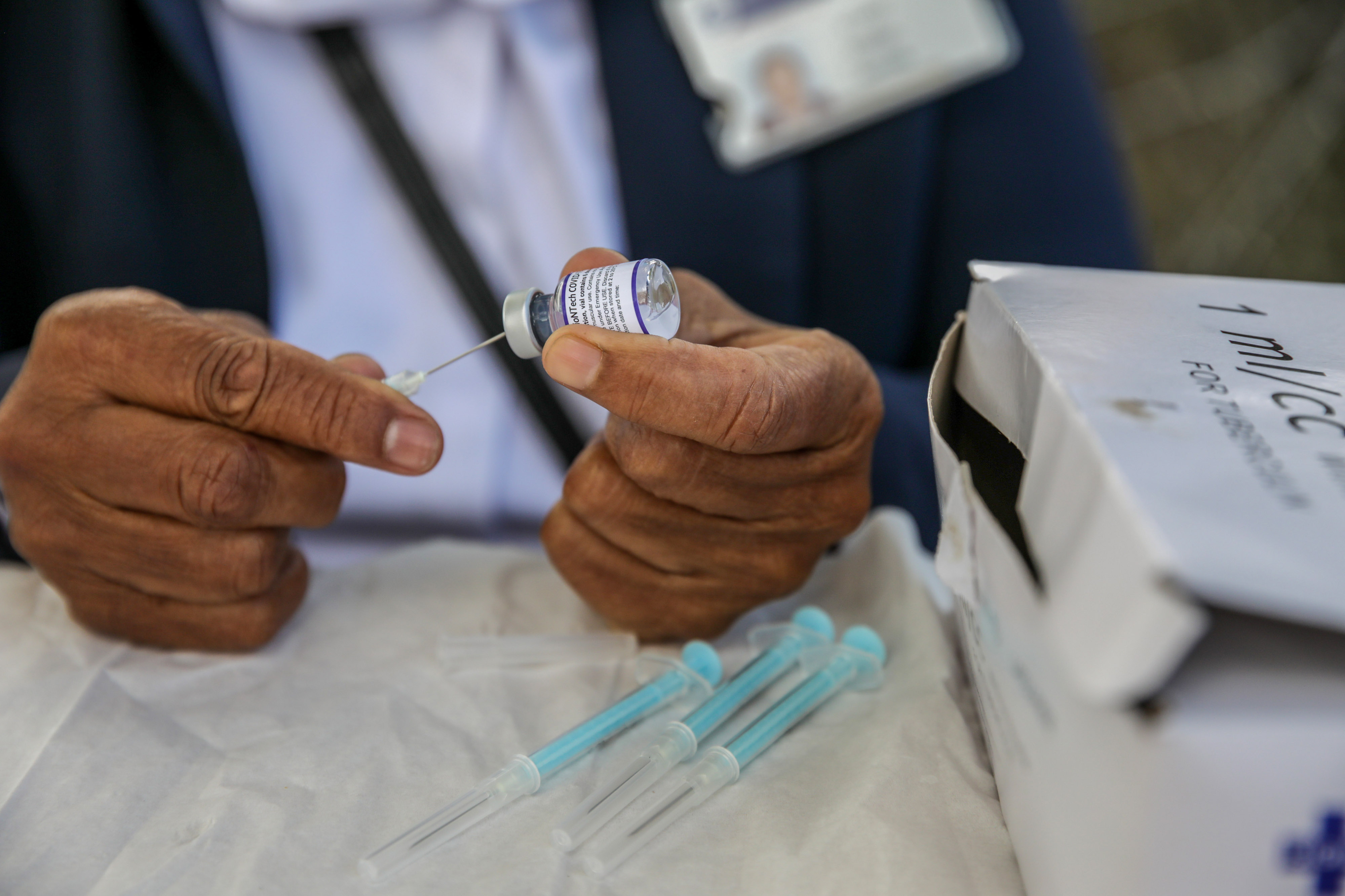 一名卫生工作者准备辉瑞-联德Covid-19疫苗的剂量。
