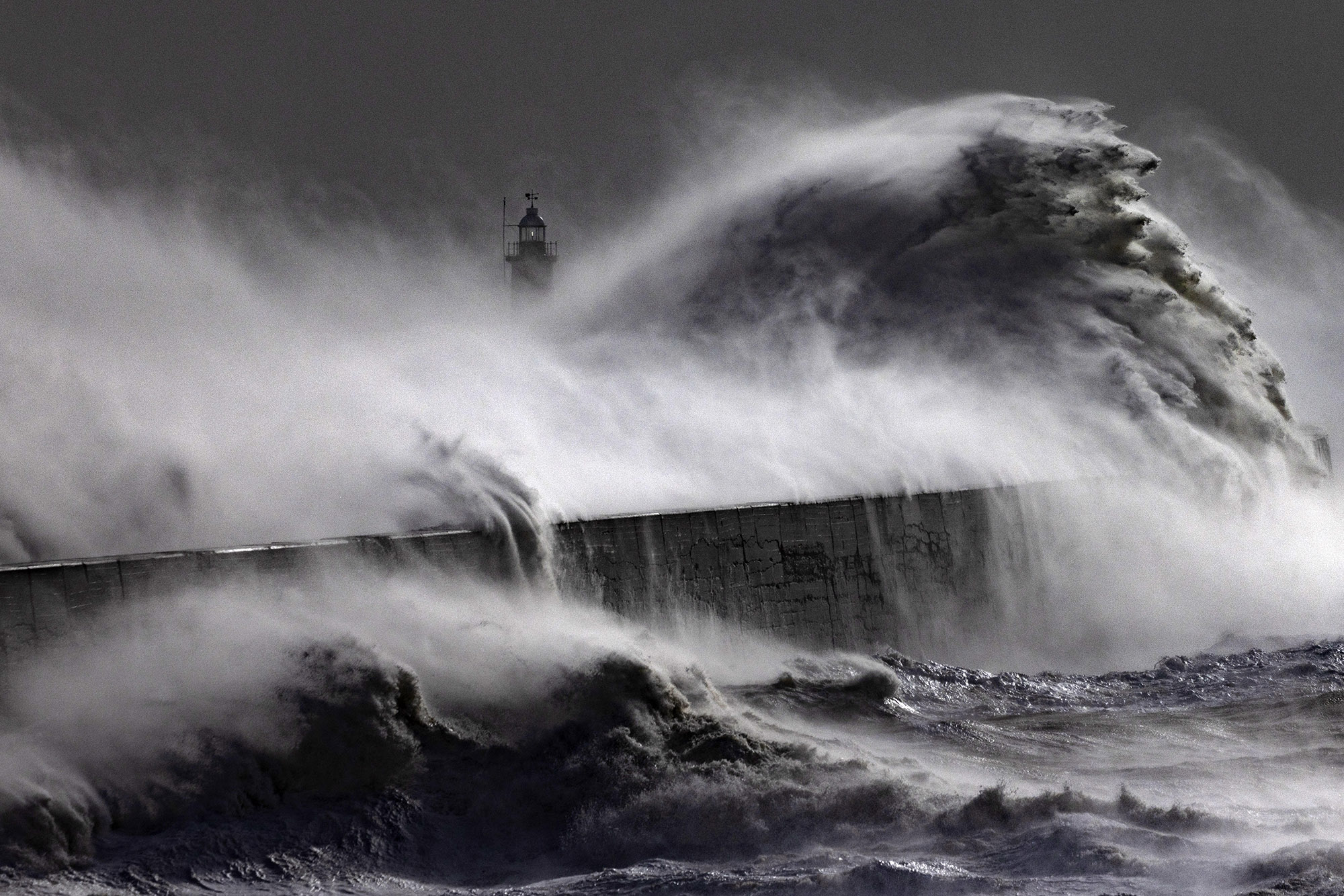 风暴浪潮袭击了新港防波堤和灯塔,日期为2月18日。