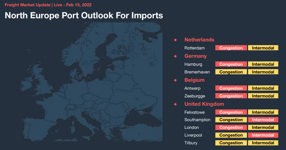 本月,Flexport编制的热图显示,包括鹿特丹、汉堡和英国费利克斯托在内的10个欧洲港口中有6个闪烁橙色。(这在绿色、黄色、橙色和黑色的等级中排名第二差。)