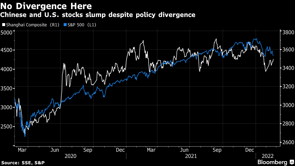 目前美国和中国股市之间的缺乏分歧与两国央行政策分歧相矛盾。中国人民银行在美联储收紧政策的同时放松,但由于政府行动的后果,亚洲国家的股市受到重创。房地产开发商在被迫整顿其负债累累的业务后仍面临压力,而科技巨头和其他重要大公司,如马云的蚂蚁集团,一直在面临各种调查和审查。