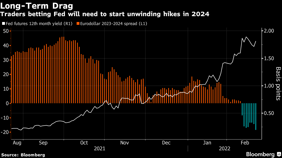 掉期迅速定价了超过35%的半个百分点的三月加息可能性,而周一的某个时候这一概率还不到15%。他们还重新完全定价了整个2022年相当于六次四分之一的加息,并且现在看到了七次的相当大机会。然而,乌克兰危机带来的不确定性在更远的地方表现出来,欧元美元合约出现倒挂,表明美联储很可能在2024年就开始降息。