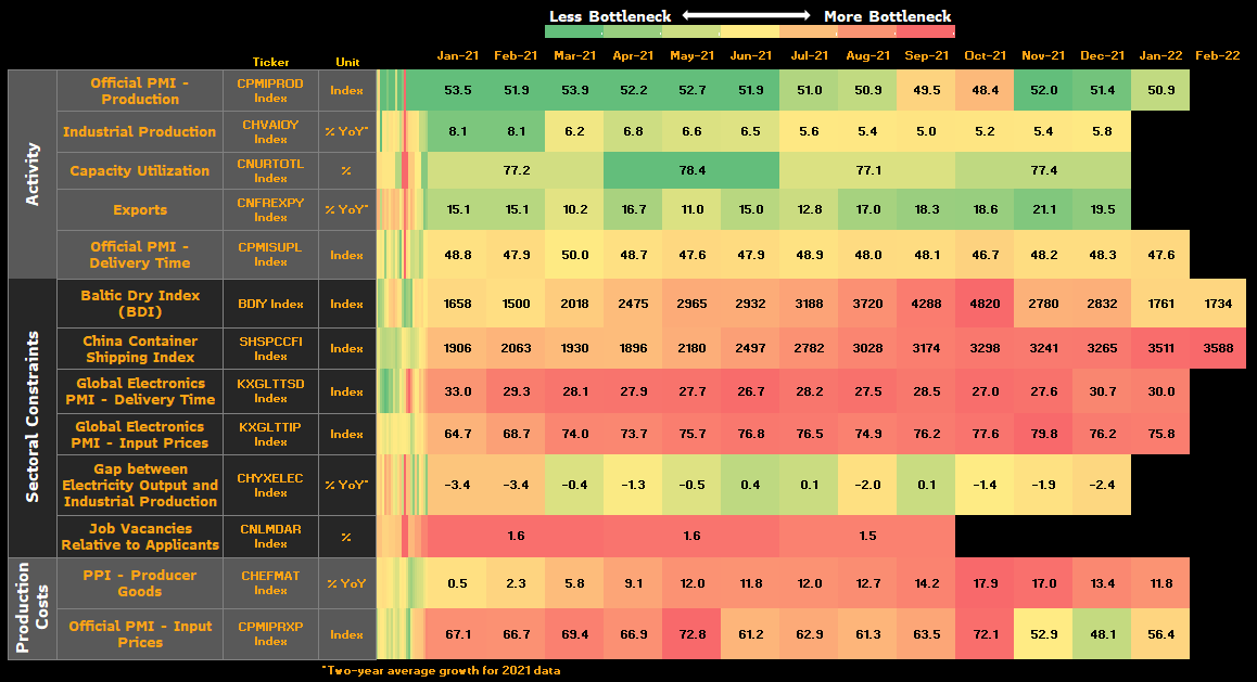 来源:彭博经济学来源:彭博经济学然而,很大程度上取决于亚洲发生了什么以及任何病毒爆发。这份彭博经济学的中国压力仪表板显示,虽然电子产品短缺已经从历史高点下降,但2022年初的数据更广泛地显示供应条件并没有明显缓解。