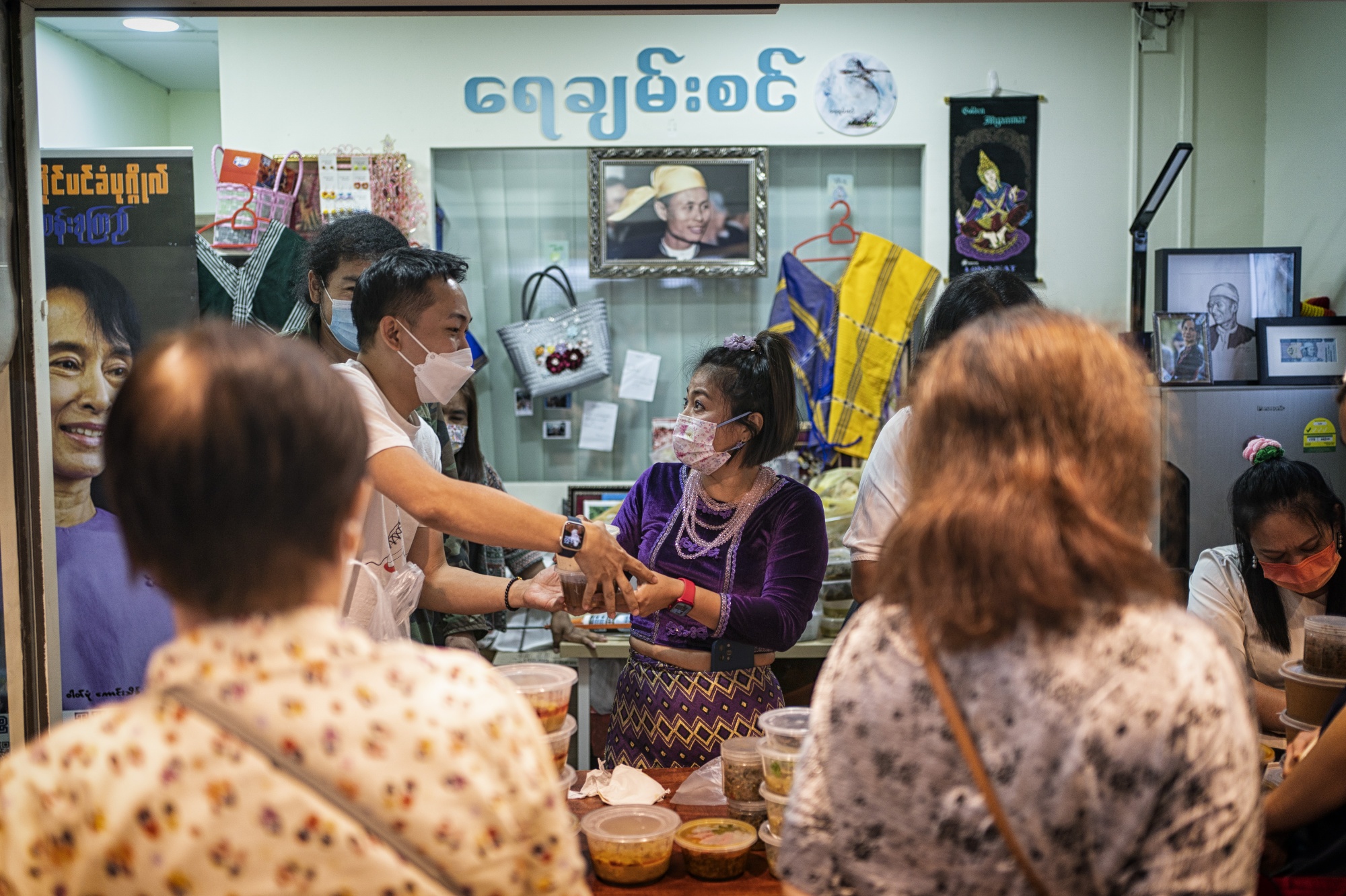 顾客们涌入一个临时食品摊位,上面装饰着被罢黜的缅甸领袖昂山素季的真人大小形象,志愿者们在那里出售自制美食,如茶叶沙拉和莫辛加(一种米粉和鱼汤)。