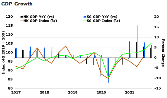彭博经济学家 塔玛拉·马斯特·亨德森 和 埃里克·朱 编制的关键数据显示,一些企业因对严格的隔离规定和无法自由旅行感到厌倦,已经开始向新加坡转移。分析师已将他们对香港今年经济增长的预测下调了0.6个百分点,至1.4%,并预计新加坡的国内生产总值将增长4.7%。