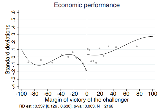 经济学家本杰明·马克斯、文森特·庞斯和文森特·罗莱特构建了一个包含自1945年以来举行的4,073次国家选举的大型数据集,然后专注于激烈的选举,以帮助剥离政府因经济衰退而被罢黜的影响。