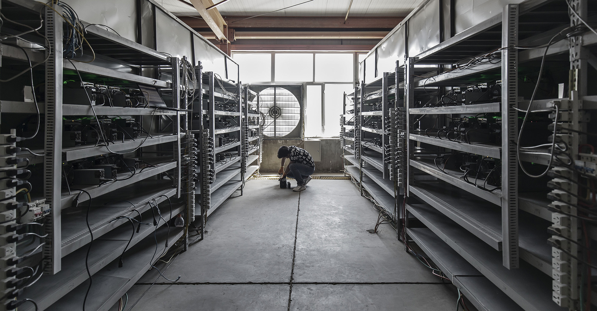 一名技术员在中国内蒙古鄂尔多斯的一个采矿设施检查比特币挖矿机。摄影师:Qilai Shen/Bloomberg