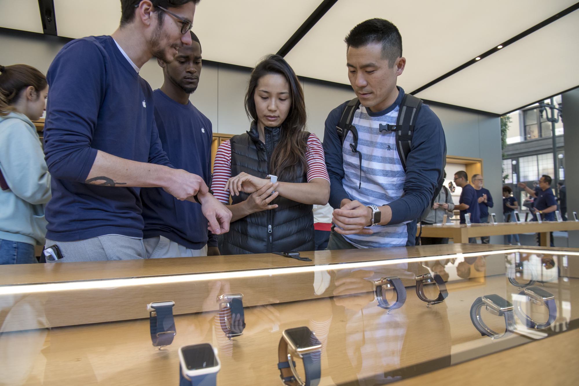 一名员工正在伦敦的摄政街苹果商店内向客户展示iPhone 11的功能。