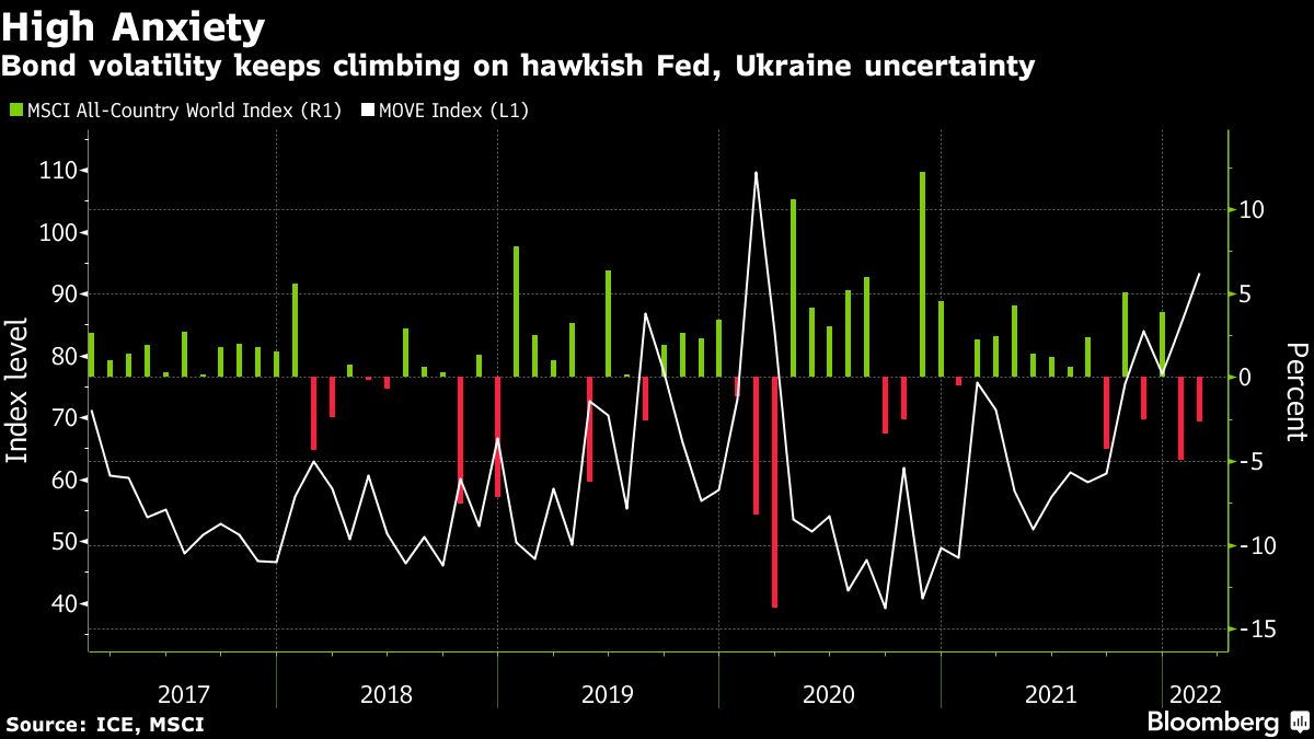 即使在乌克兰危机升级之前,国债市场已经非常波动,而这一趋势可能会因周末宣布的制裁而加剧,特别是冻结俄罗斯银行资产的举措。美联储结束债券购买并在三月后提高利率的举措一直是国债波动的主要推动因素,但这些举措大多是为了推高收益率。乌克兰危机引发了强烈的下行趋势,同时也加剧了推动这些早期增长的通货膨胀压力。