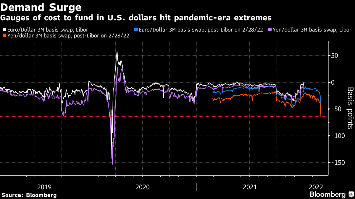 不用看得太远,就看跨货币基差互换,各方在不同货币之间借贷。支付或收取的利率基于当地借贷基准利率,再根据基差互换利率和其他变量进行调整。这些互换交易通常基于当地货币的Libor,直到金融监管机构迫使银行远离这些利率,现在大多数使用继任利率。看看“旧”的互换和“新”的互换,欧元和日元投资者获取美元资金的折扣刚刚膨胀到上次在2020年3月疫情恐慌期间见到的水平。只要基差互换达到极端水平,市场情绪不太可能持续改善。