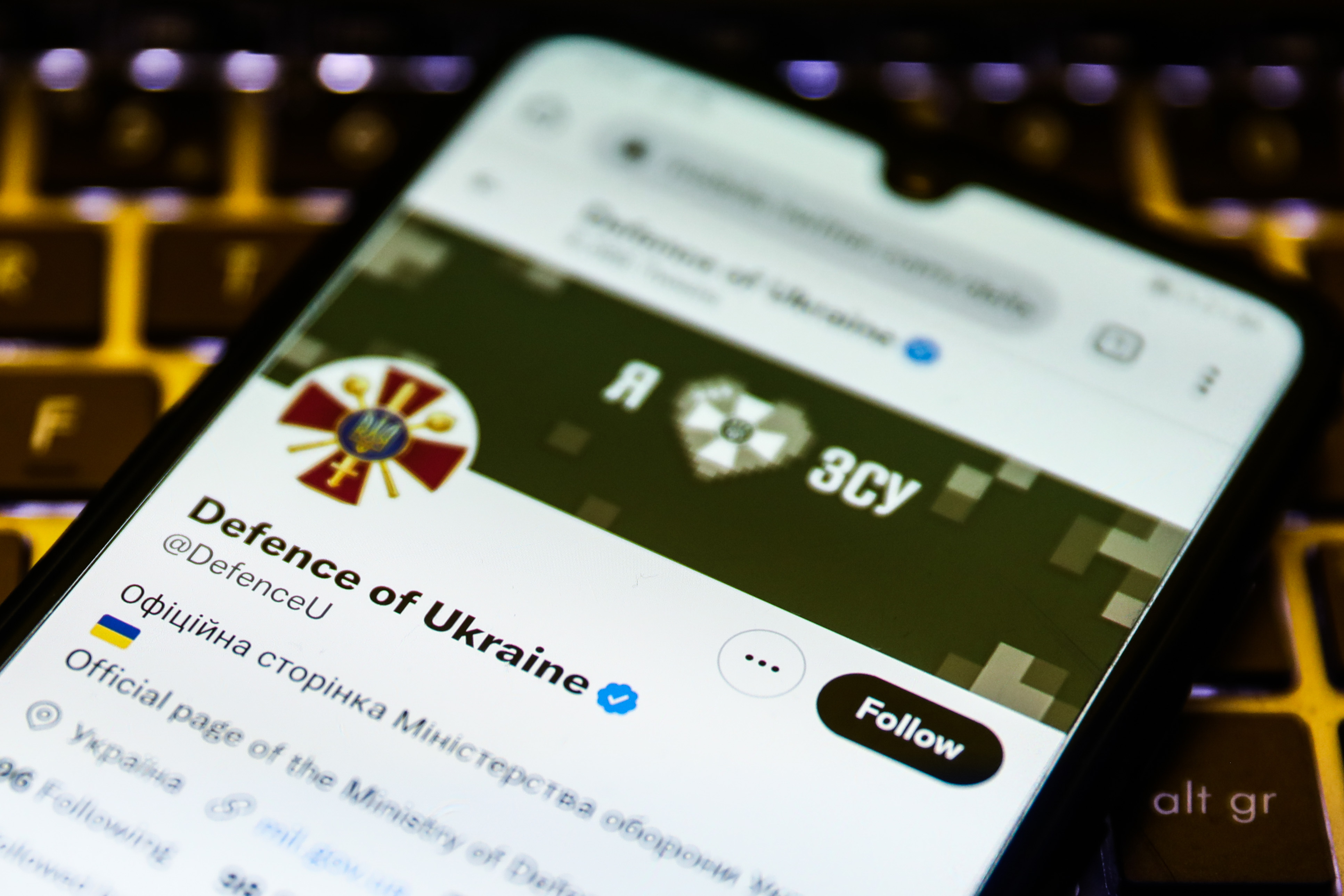 乌克兰国防部的Twitter账号显示在2022年2月15日波兰克拉科夫的手机屏幕上。