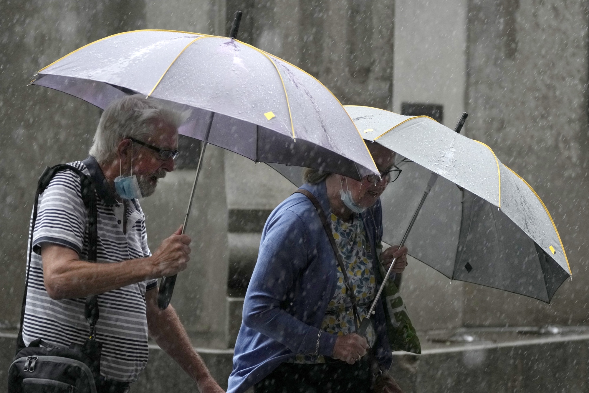 行人在悉尼使用雨伞遮挡雨水,2022年3月2日星期三,由于澳大利亚东南部沿海地区遭受了十多年来最严重的洪水,洪水正在从昆士兰州向新南威尔士州南部蔓延,这是自2011年被描述为百年一遇事件以来该地区最严重的灾难。(AP Photo/Rick Rycroft)