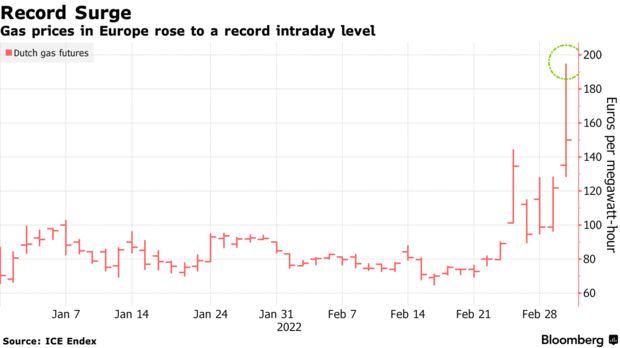 拜登在国情咨文的前10分钟致力于俄罗斯入侵乌克兰。摄影师:Saul Loeb/AFP/Bloomberg战争继续动荡着商品和金融市场。随着交易商开始抵制俄罗斯原油,石油价格飙升至每桶110美元以上。欧洲天然气价格创下历史新高,涨幅高达60%,这引发了该地区工业停电的可能性。随着小麦和玉米运输受到干扰,食品价格将飙升。