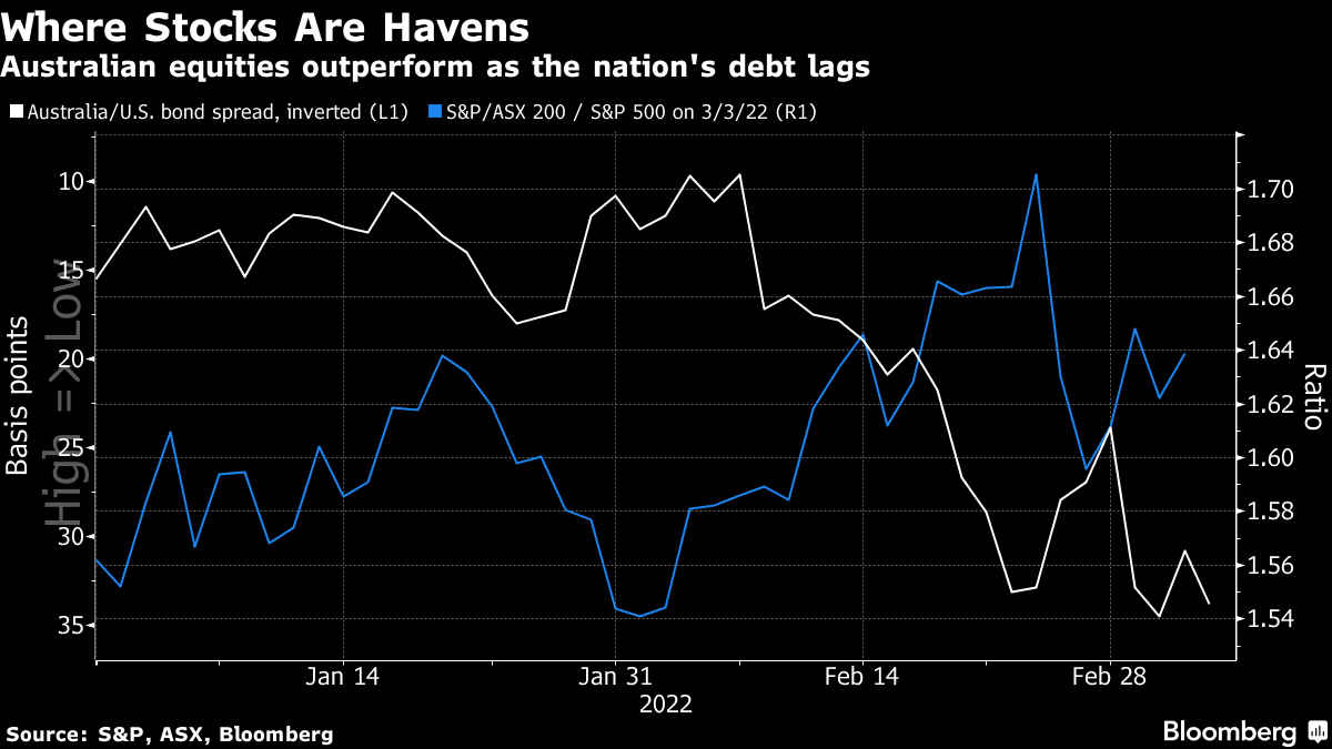 澳大利亚市场正在受到乌克兰战争的影响,全球债券特别面临不确定的货币政策前景的颠覆。澳大利亚的股票和货币表现优异。激增的大宗商品价格推高了澳大利亚元,也推高了作为基准股票指数最大成员之一的主要矿业公司。有一种感觉,澳大利亚经济在很大程度上与全球经济受战争影响和对俄罗斯实施的制裁隔离开来。