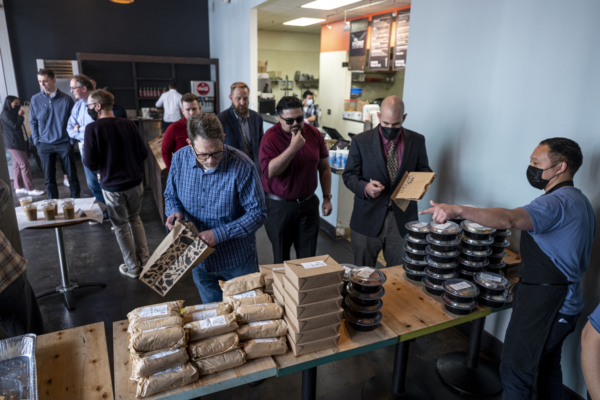 BlackRock员工在3月2日在Spice Kit等待午餐。摄影师:David Paul Morris/Bloomberg