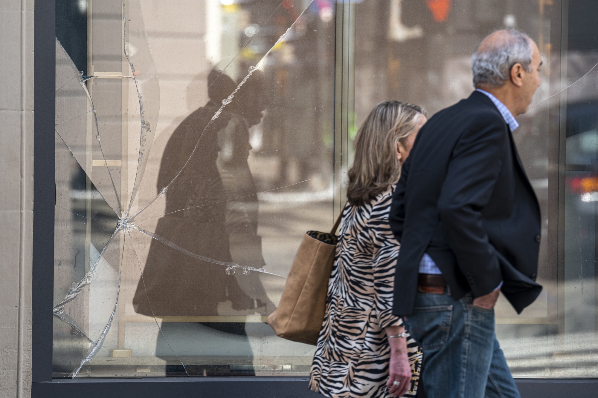 旧金山市中心的一扇破窗户。摄影师:大卫·保罗·莫里斯/彭博社回到办公室对于旧金山市长伦敦·布里德来说变得更加紧迫,她在周四宣布,富国银行等雇主承诺实施政策,要求员工以某种方式回到办公室工作。该市要求其员工在3月7日恢复到现场工作。