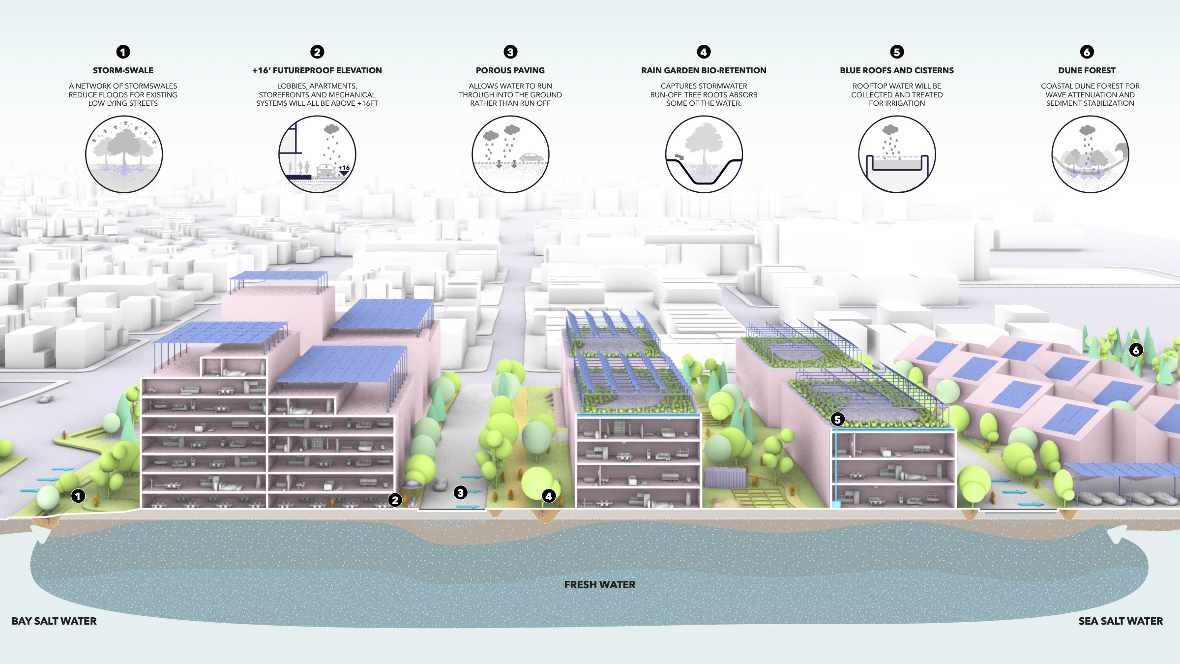 发展计划水资源韧性的插图。信用:当地办公室景观与城市设计领导该项目的L+M开发合作伙伴的高级总监萨拉·莱文森表示,她意识到不同利益相关者对该计划会有不同的反对意见。“但从半杯水的角度来看,这里对每个人都有好处,每个人都可以支持这个计划,”她说。