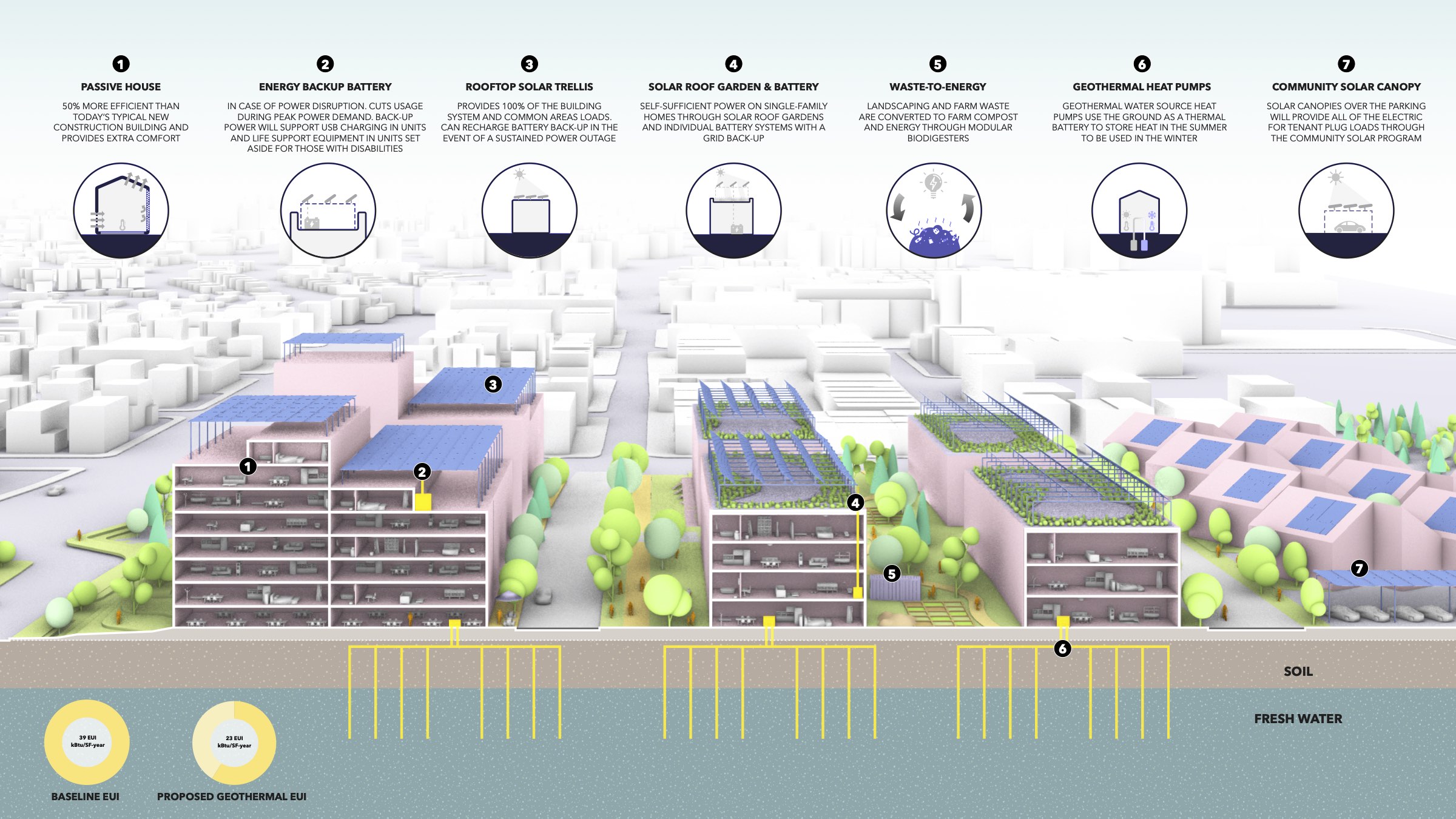 为了实现净零,该开发项目将采用一系列策略,包括太阳能屋顶花园和被动房屋,这是一种涉及密封绝缘的设计方法。但项目的大部分将依赖地热能的使用,这种技术利用地球核心储存的热量来为开发项目中的所有建筑供暖、制冷和提供热水。该项目将成为纽约市首个依赖这项技术的重大开发项目。