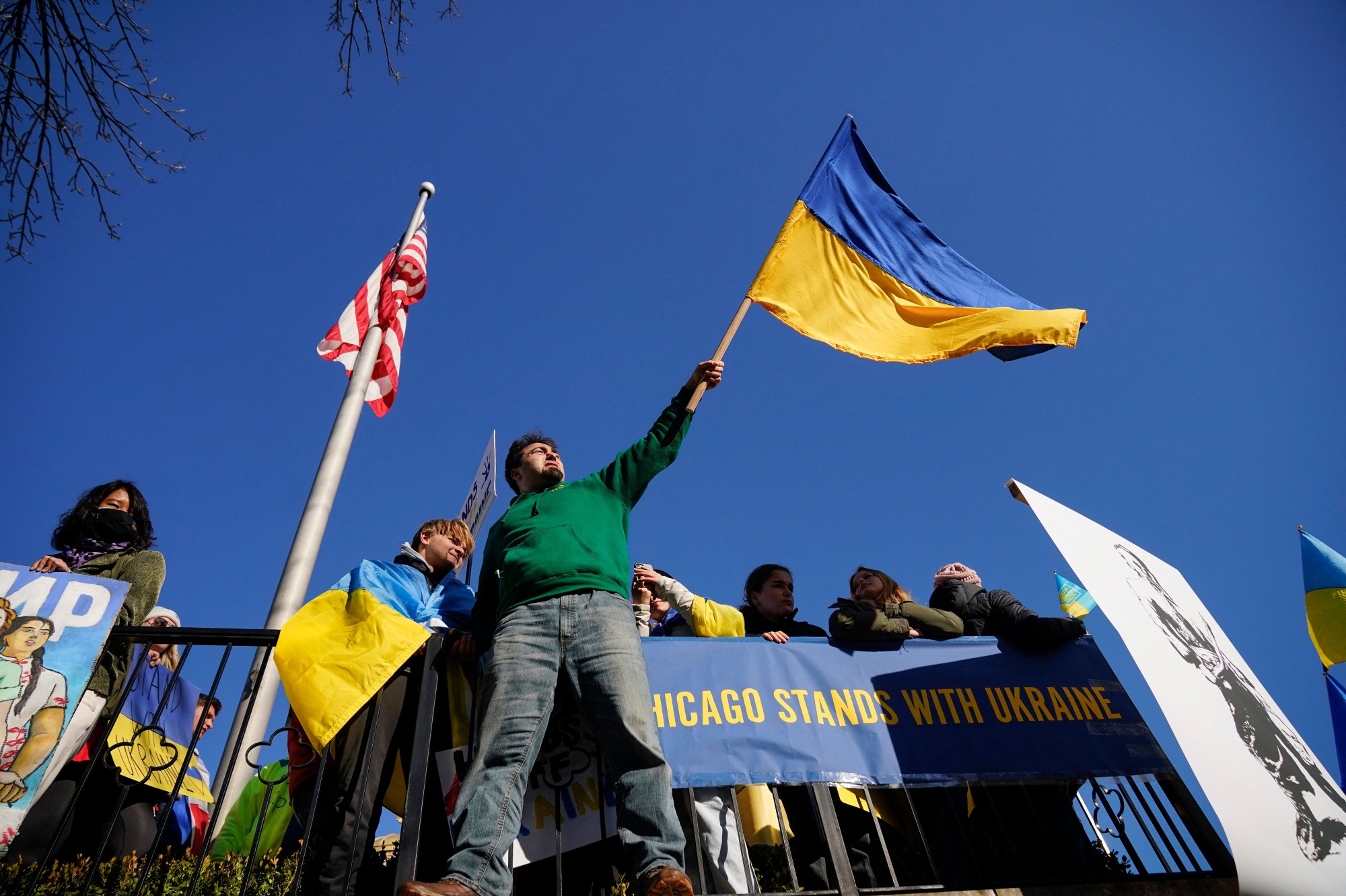 芝加哥的示威者在2022年2月27日在圣弗拉基米尔和奥利亚乌克兰教堂前抗议俄罗斯入侵乌克兰。