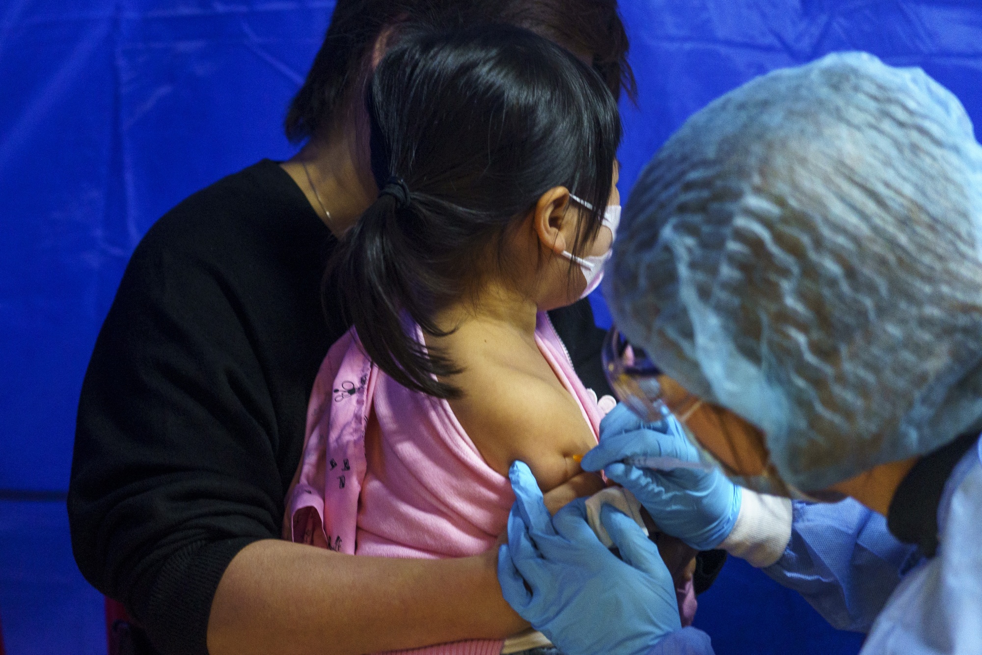 周日,一名儿童在香港接种疫苗。摄影师:Justin Chin/Bloomberg