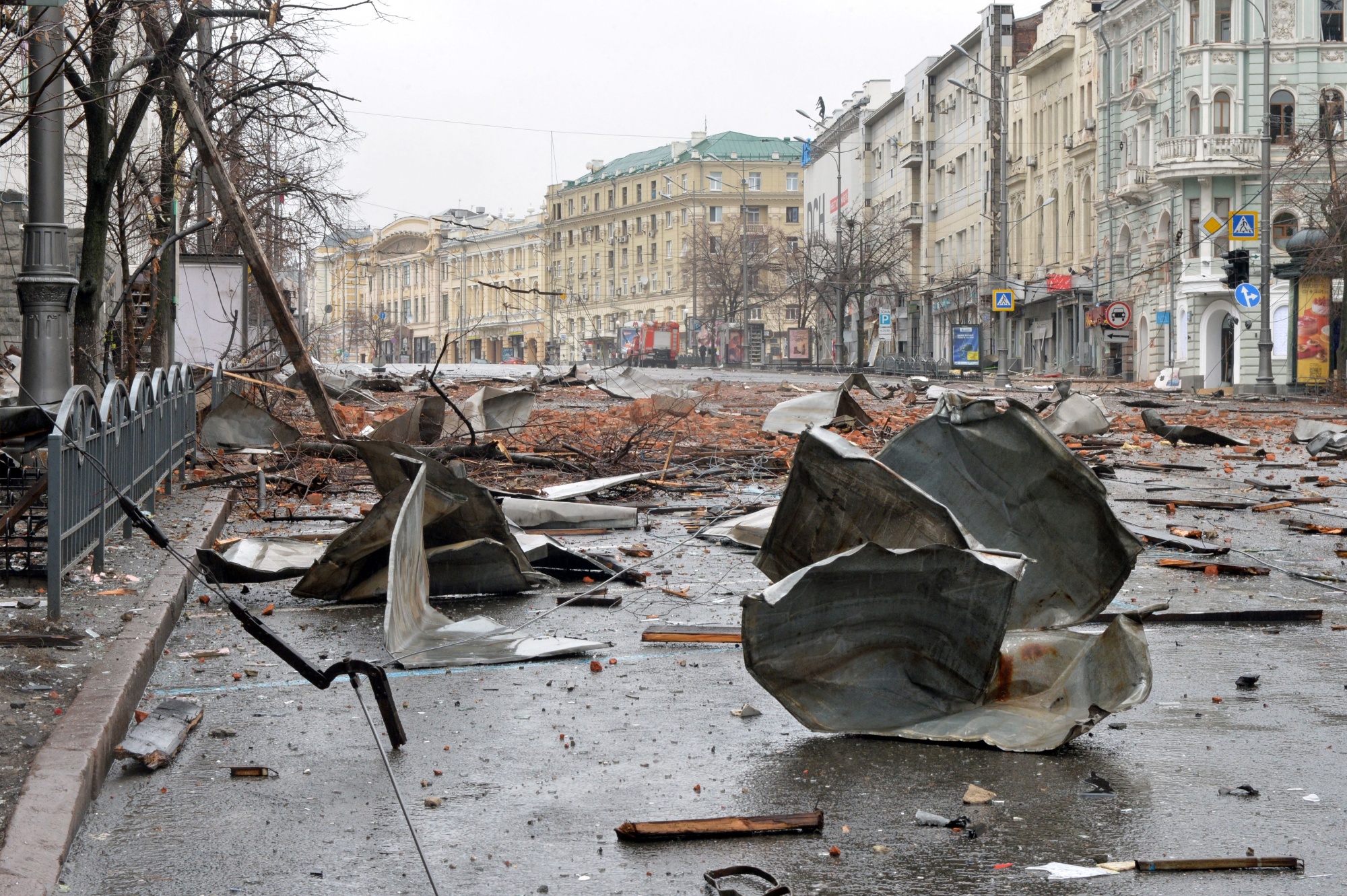 哈尔科夫遭到炮击后的宪法广场,乌克兰,3月2日。