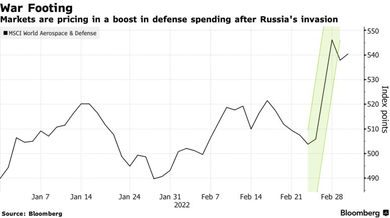 并非股市的所有领域都因俄罗斯入侵乌克兰及随后的制裁而受到影响。随着德国对俄罗斯的侵略作出回应,承诺逆转几十年来在军事开支上的克制,国防股票飙升。