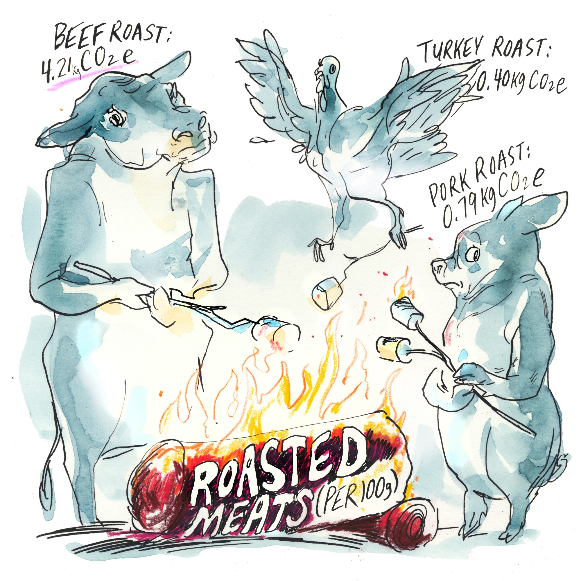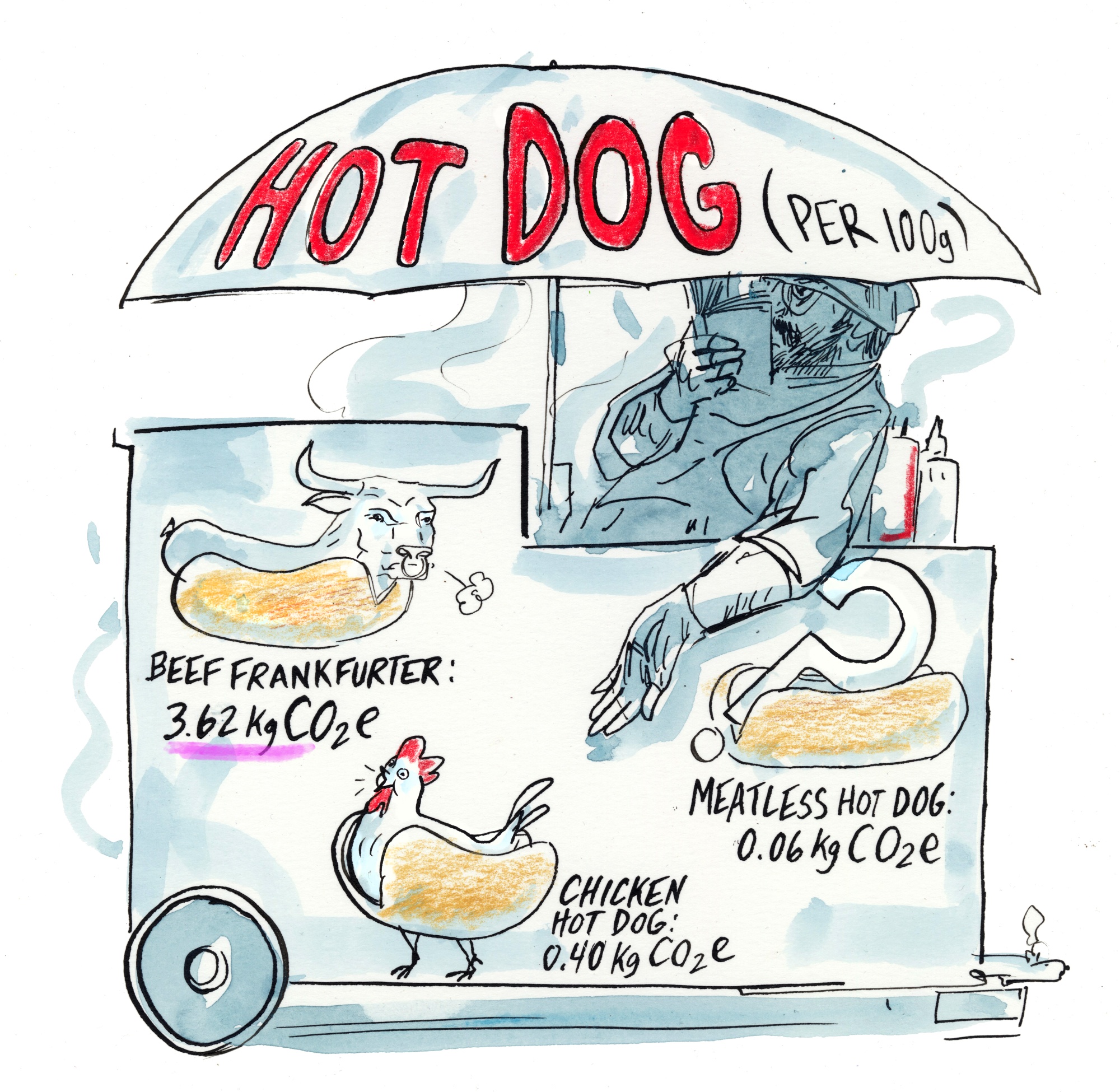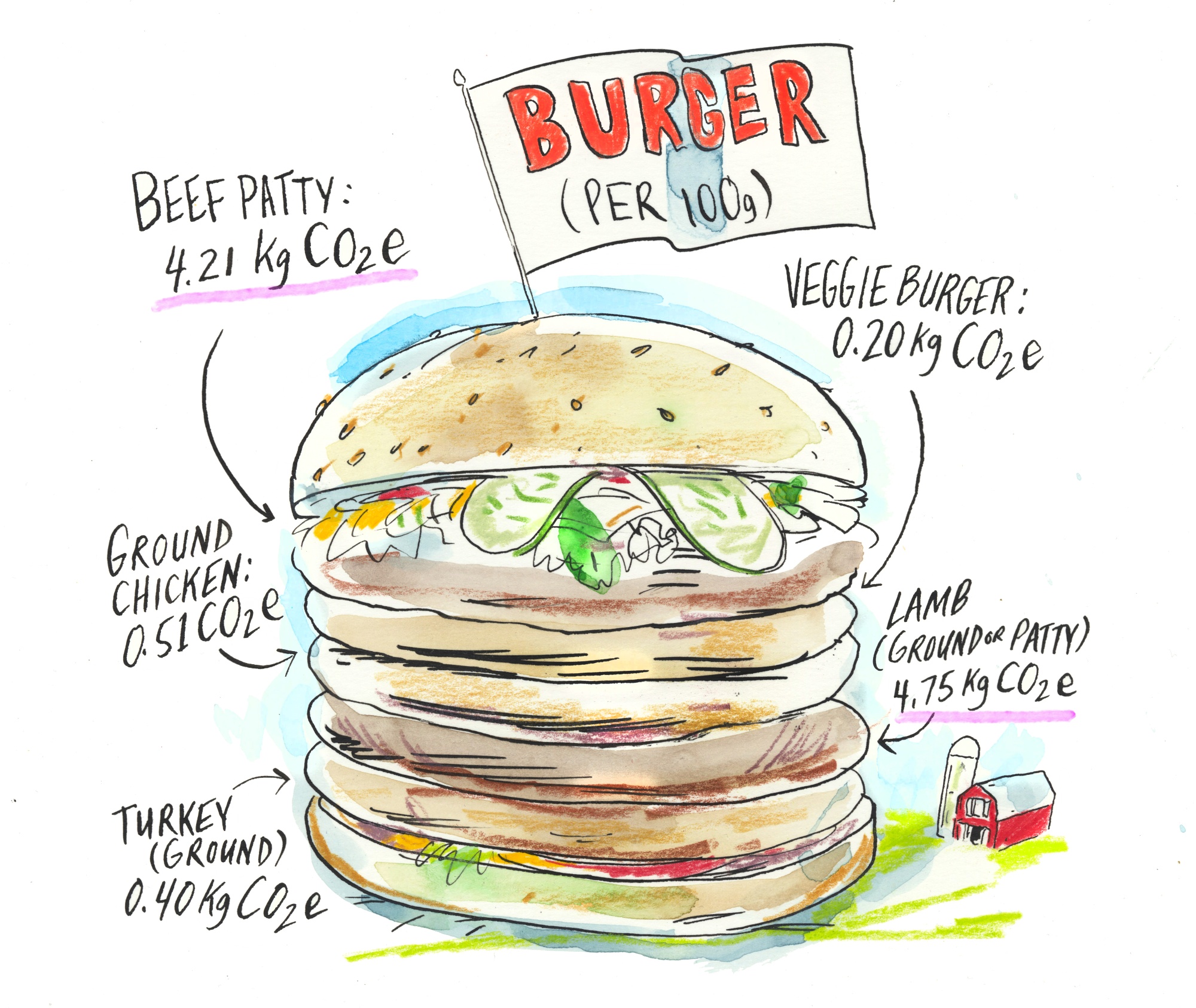 牛肉的排放影响没有普遍的数字,因地区、农场类型、放牧习惯和其他因素而异。但数十项研究确定牛肉是最严重的排放者之一。一篇论文指出,仅来自牛群生产的排放通常在每公斤可食重量的二氧化碳当量约为79至101千克之间。这与鸡肉的整个供应链(包括生产)的3至21千克CO2e相比。 (奶牛的生产排放量为8至75千克CO2e,较低,因为它们被用于肉类和奶制品。)