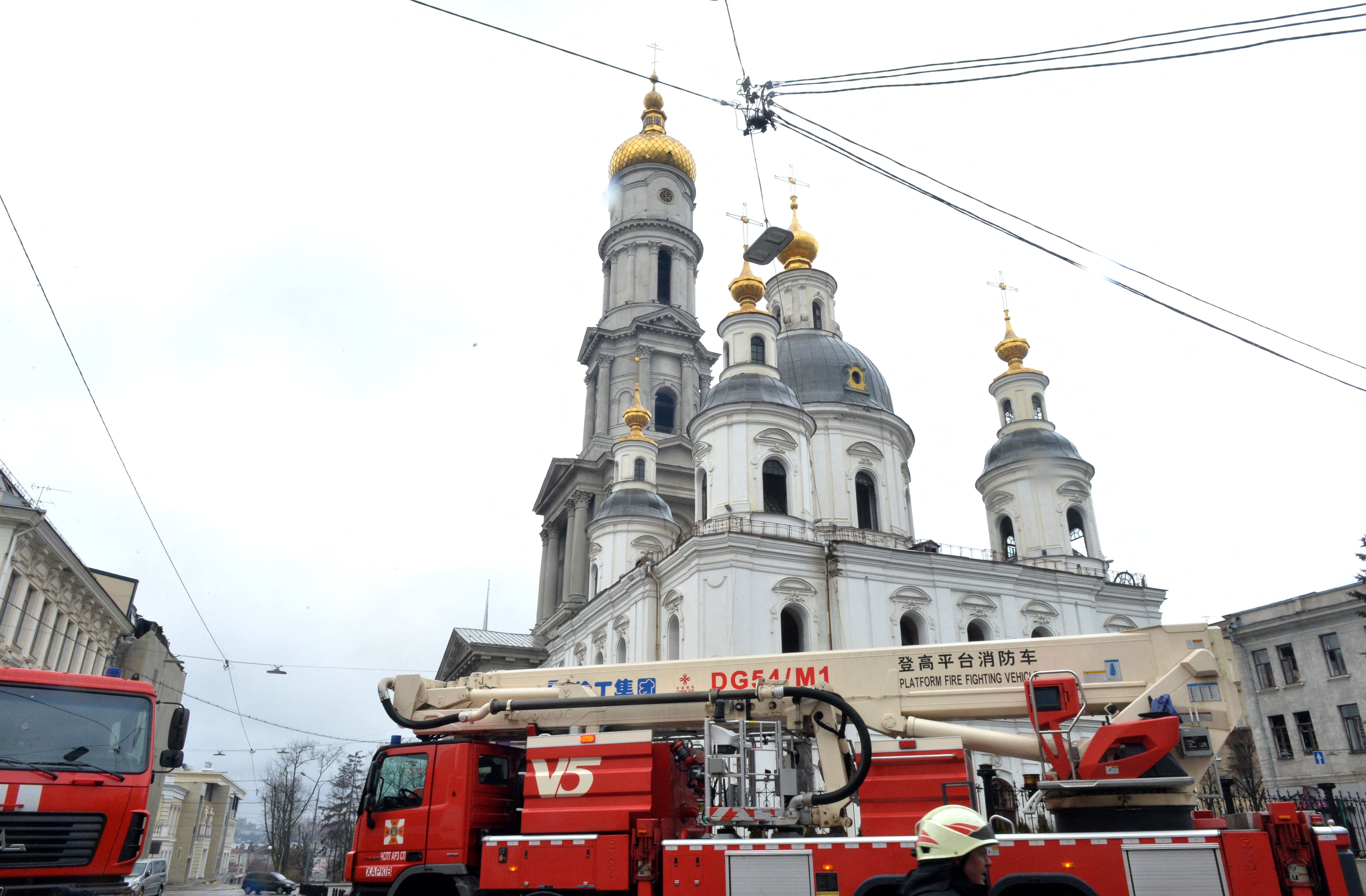 哈尔科夫圣母升天大教堂附近的消防车在3月2日遭受炮击后。摄影师:谢尔盖·博博克/法新社/盖蒂图片社
