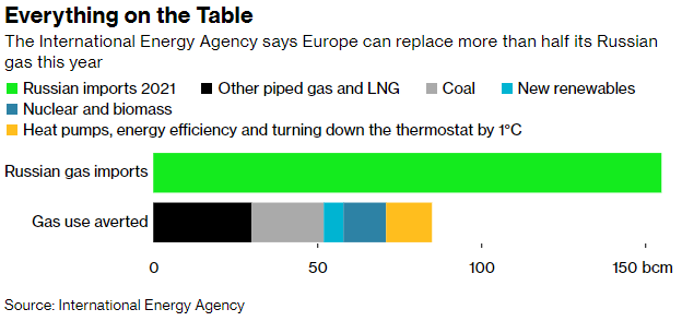 欧洲每天花费高达10亿美元用于支付从俄罗斯进口的煤炭、天然气和石油 —— 间接资助了正在乌克兰境内推进的战争机器。用煤炭和石油替代天然气的困境不在于它们的供应情况,而在于它们对地球和欧盟世界领先的气候政策的影响。根据彭博的计算,使用煤炭而不是天然气将使欧盟的排放量增加约8%。但短期内排放量的增加可能是最不坏的选择。