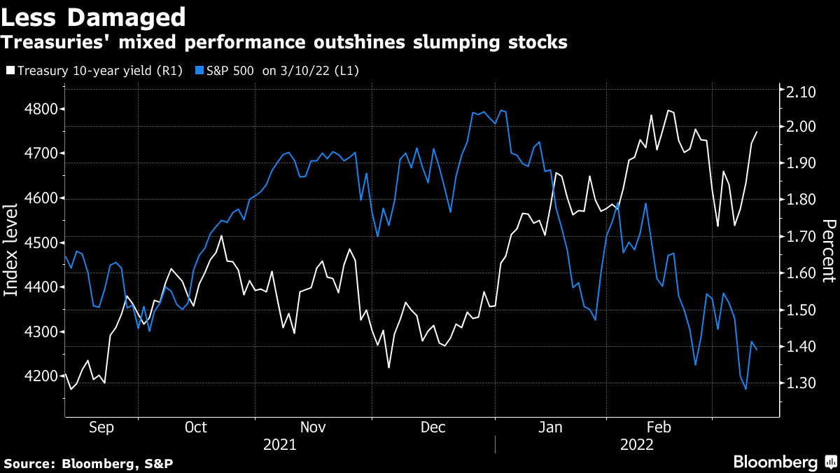 是的,债券今年表现不佳,有时甚至非常糟糕,但它们的表现比股票更加细致。尽管乌克兰战争加剧导致标普500指数下滑,国债收益率已经回到了起点。两种资产类别都表现不佳 —— 60/40策略可能会比两年前疫情爆发时的损失更大 —— 但债券仍然提供某种程度的避风港。