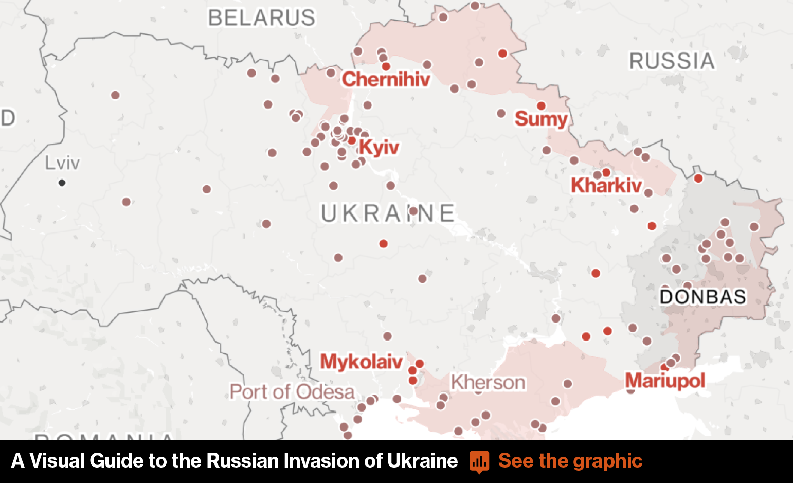 俄罗斯占领的乌克兰领土区域和被报道袭击的地点。资料来源:彭博社,战争研究所与美国企业研究所的关键威胁项目基辅表示不会割让任何领土。它要求北约在武器方面提供更多支持,实施禁飞区(北约不会支持)以及欧盟成员资格。这与…中立相反。
