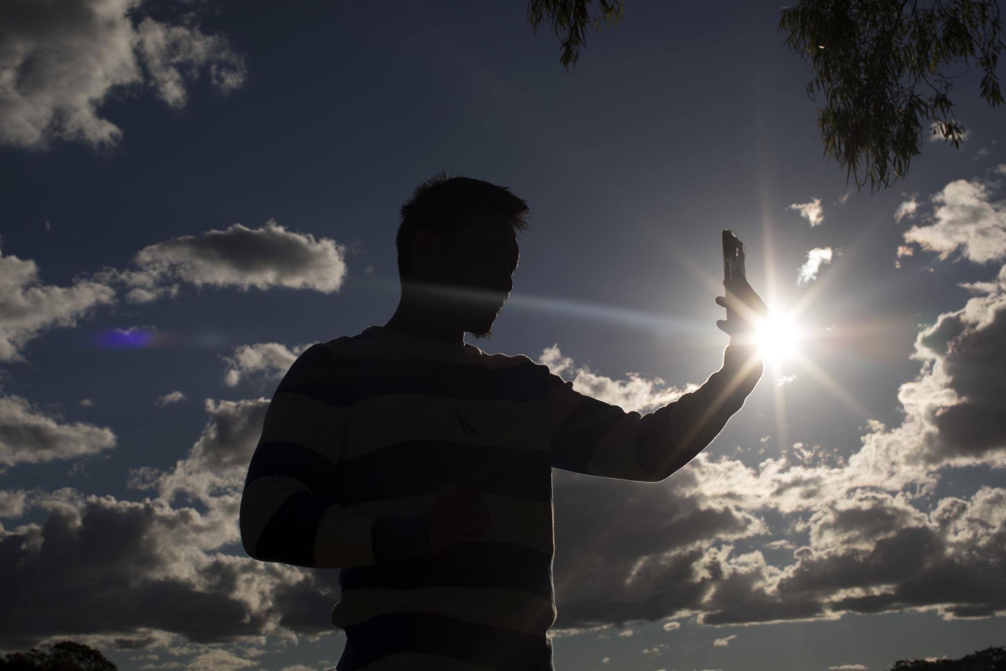 一个虚拟货币推广者在悉尼用智能手机制作视频。