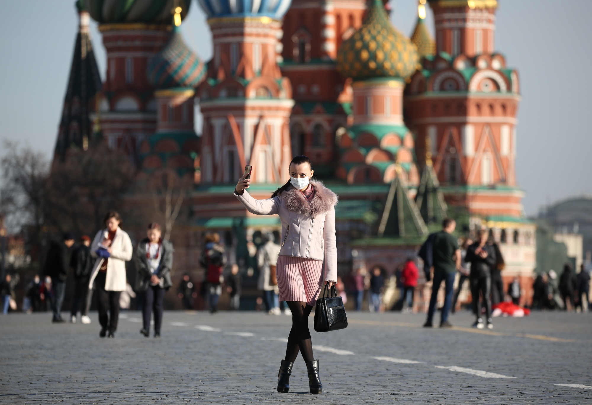 一名游客在2020年3月26日拍摄的自拍照中,站在莫斯科克里姆林宫附近的红场上。