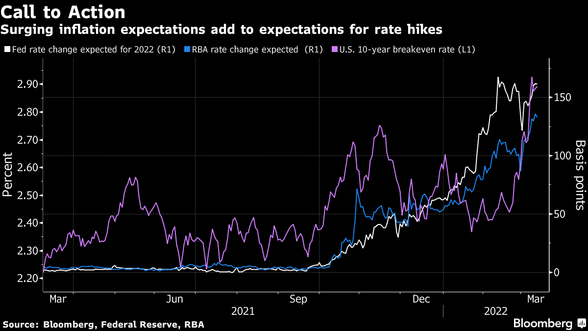 本周早些时候,政府债券在周一早盘上涨后出现抛售,导致基准10年期美国国债收益率一度跌至1.67%的两个月低点。尽管俄罗斯入侵乌克兰的后果引发了一波避险需求,但所有这些都最终破灭在通胀担忧的陡峭岩石上。随着原油期货飙升至每桶130美元以上,债券市场的通胀预期在美国和欧洲达到了创纪录的高位,甚至在周四的美国消费者价格指数公布之前,市场已经预期40年来最高的年度通胀率。