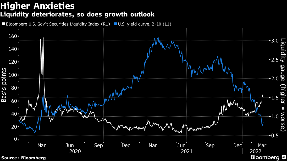 除了更广泛的资金蔓延外,债券市场本身也在发出新的警报,既有关于流动性的 -- 随着交易条件恶化 -- 也有关于增长前景的,随着收益曲线向零飙升。
