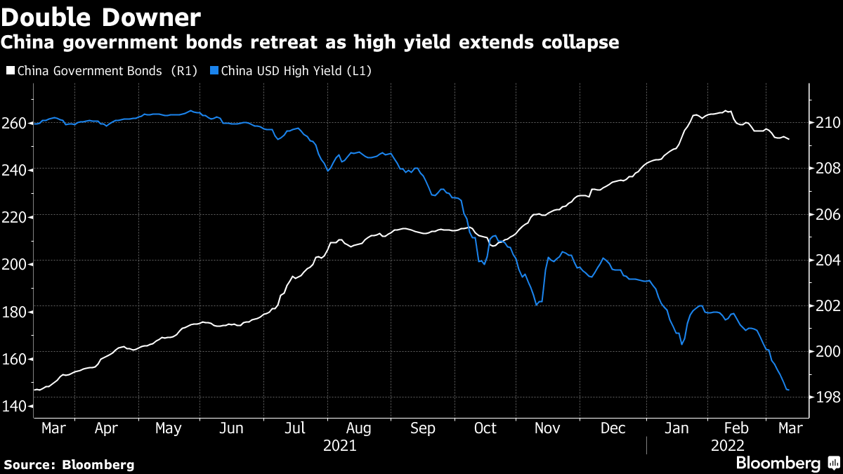 自俄罗斯于2月24日入侵乌克兰以来,中国债券在彭博跟踪的主权市场回报排名中跌至第29位。而在一月份,中国名列前茅。在投资者正在平仓的其他迹象中,全球基金上个月削减了创纪录的350亿人民币(55亿美元)的持仓。