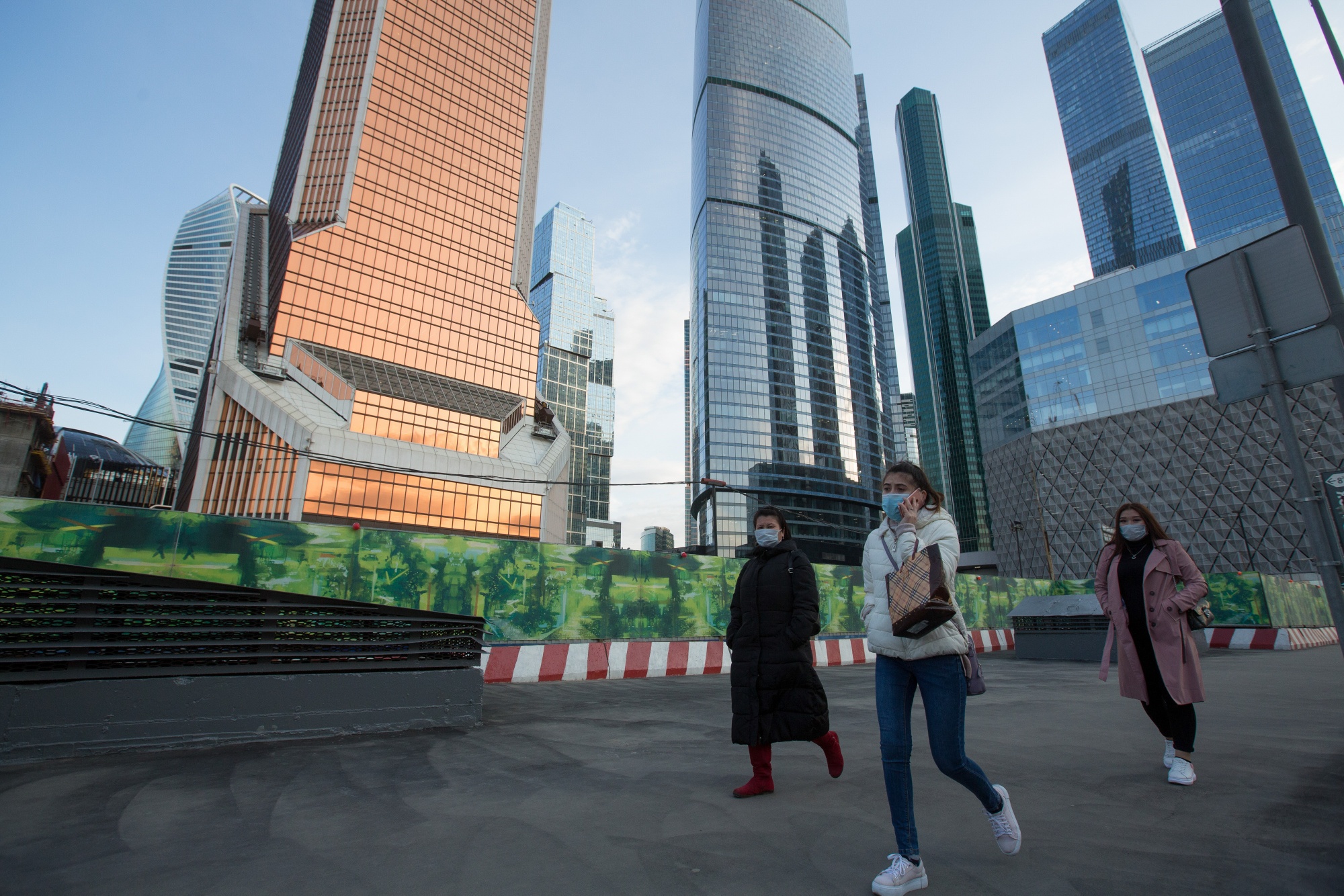 行人在莫斯科国际商务中心的摩天大楼前行走。