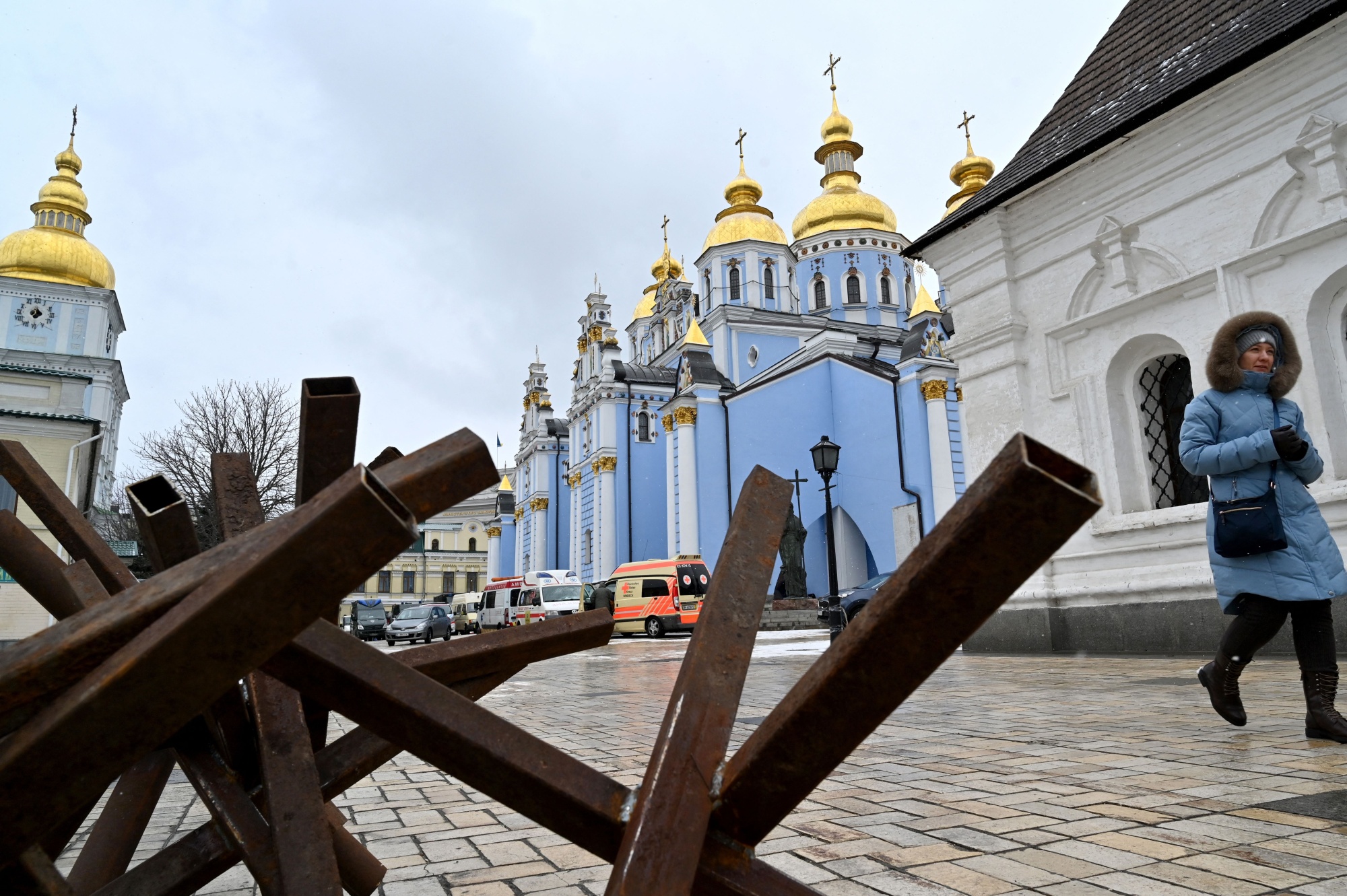 钢铁路障挡住了基辅米哈伊洛金顶大教堂外的街道,日期为3月13日。