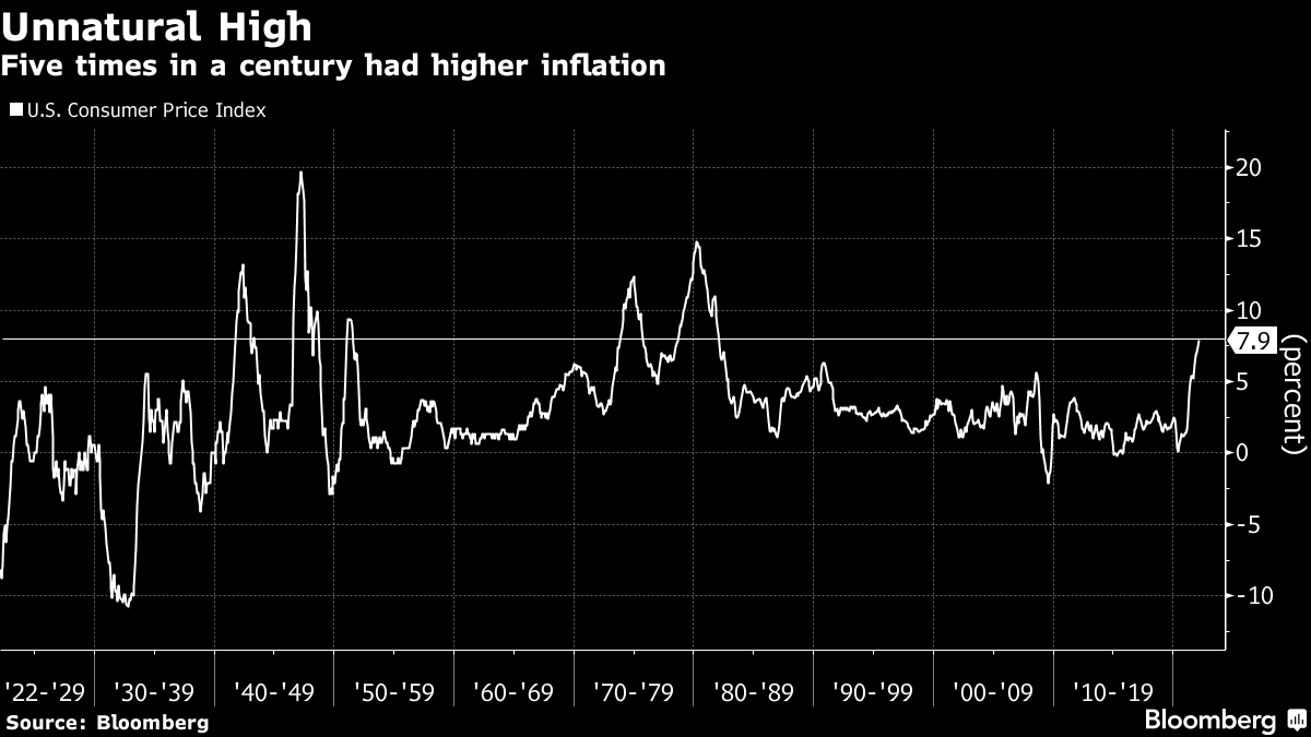 我的同事Andrew Husby和Anna Wong来自彭博经济学,他们 运行了数字 并认为每桶160美元的油价将导致通胀率在3月初达到近10%。最近油价回落至100美元以下,这种情况并不太可能发生,但也不是完全不可能的情况。 这里有个棘手的部分。这不是上世纪70年代,那时这样的大数字是常态。但在过去100年中,只有五个时期的通胀率比这更高。