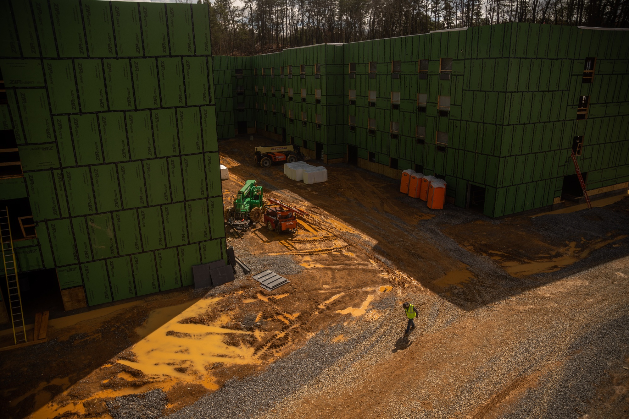 Dollywood员工住房的建设。摄影师:Liam Kennedy/Bloomberg即使按宿舍标准来看,住宿条件也很简陋 —— 每间325平方英尺的房间有四张床位,尽管租户将拥有一个共用厨房和聚会空间。每位租户的租金为每月$500,该宿舍预计将于5月底开放。
