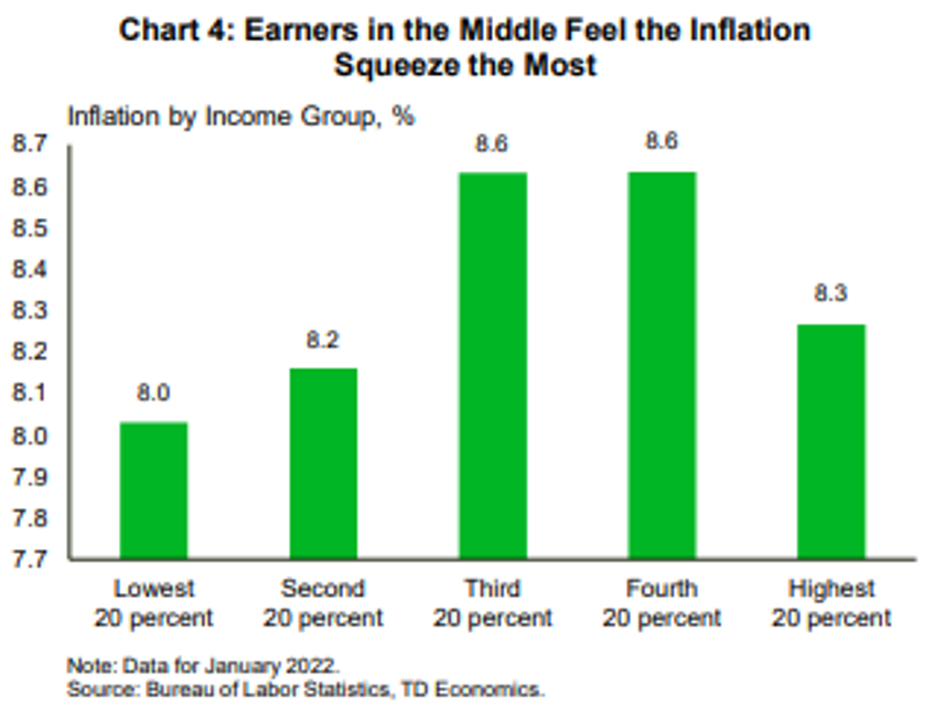 据TD称,中等收入群体通货膨胀约40%归因于二手车和汽油,这两者占他们消费篮子的8.72%。而最低收入群体的比例为6.98%,最高收入群体为7.06%。