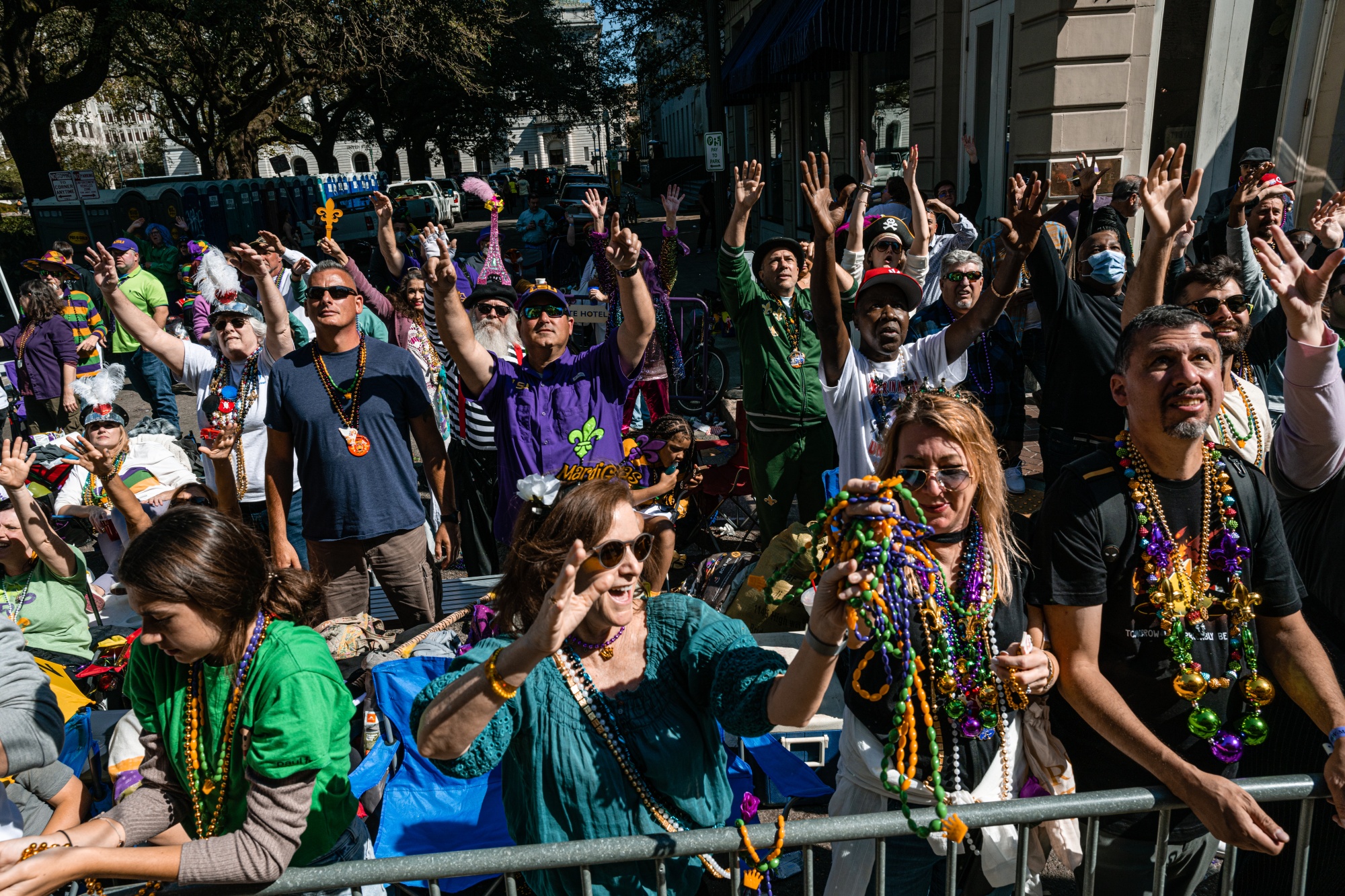 参加者在美国路易斯安那州新奥尔良举行的狂欢节游行中从花车上接住串珠。