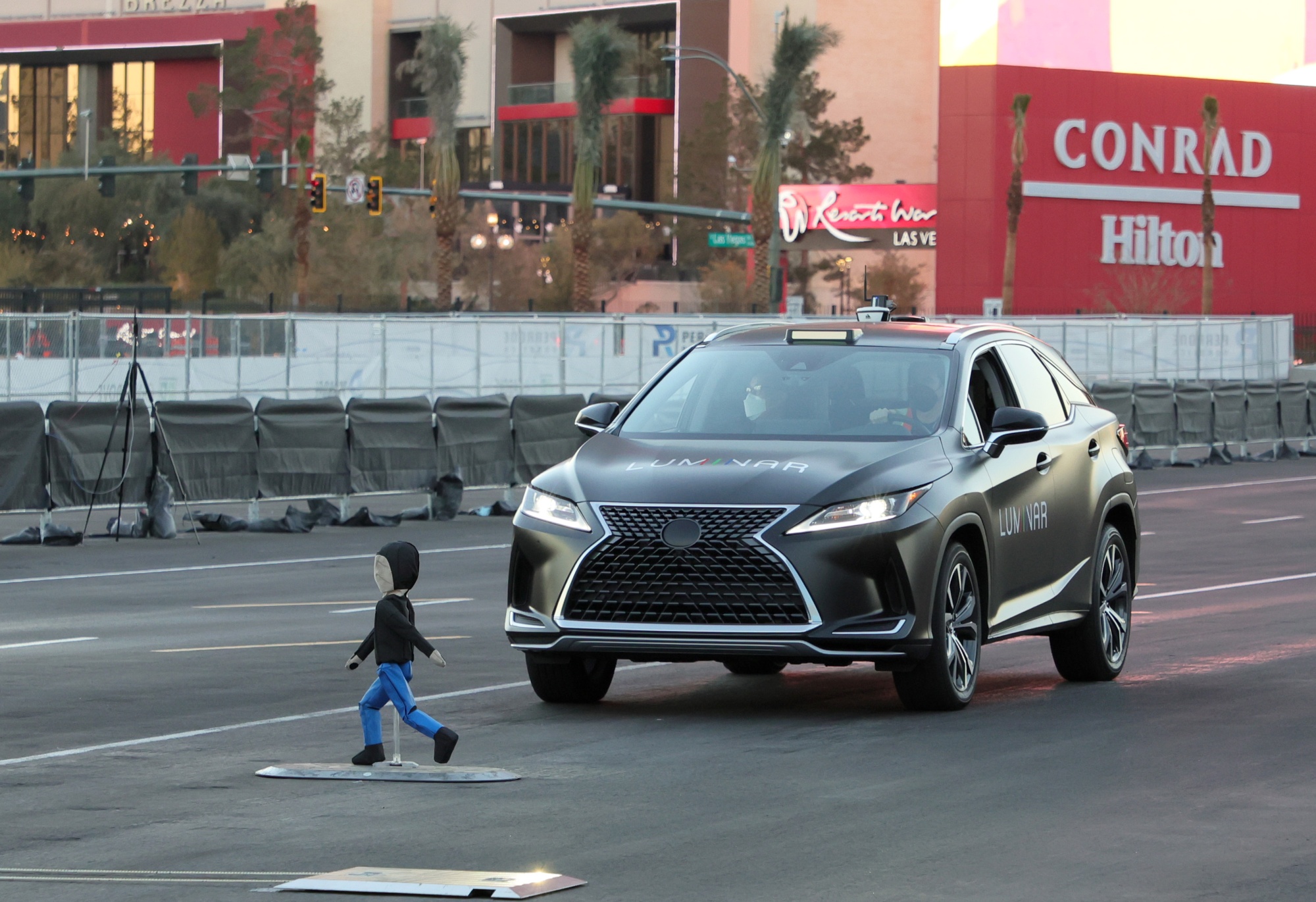 一辆配备自动制动技术的雷克萨斯汽车在2022年1月的消费电子产品贸易展CES上进行安全演示,避免与碰撞测试假人相撞。