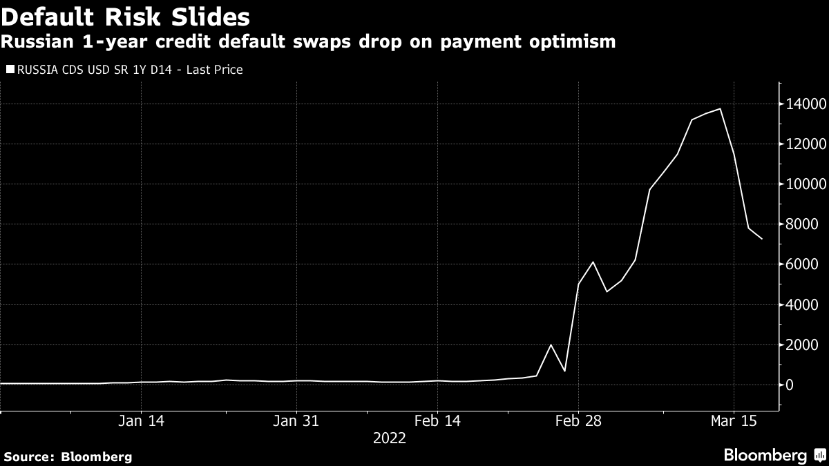 仍然存在许多疑问 — 例如,俄罗斯主权债券的欧洲债权人尚未收到资金的迹象,而该国的企业债务则是另一个完全不同的问题 — 但投资者似乎松了一口气。根据信用违约互换定价,俄罗斯在未来一年内违约的暗示概率降至57%,而上周曾高达80%。