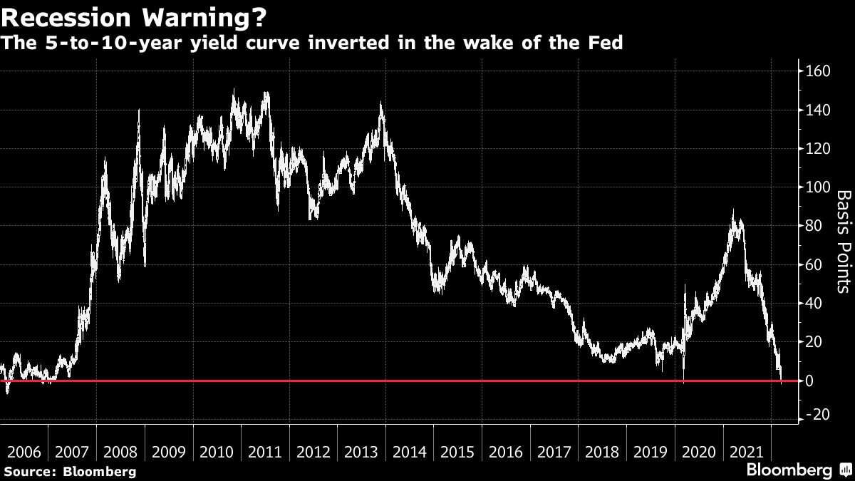 “市场正在定价更高的衰退风险,你可以从五年期和十年期收益率倒挂中看到这一点,”加拿大皇家银行全球资产管理美国固定收益主管安德烈·斯基巴说。“美联储正在发出强烈的抑制通胀的承诺。”