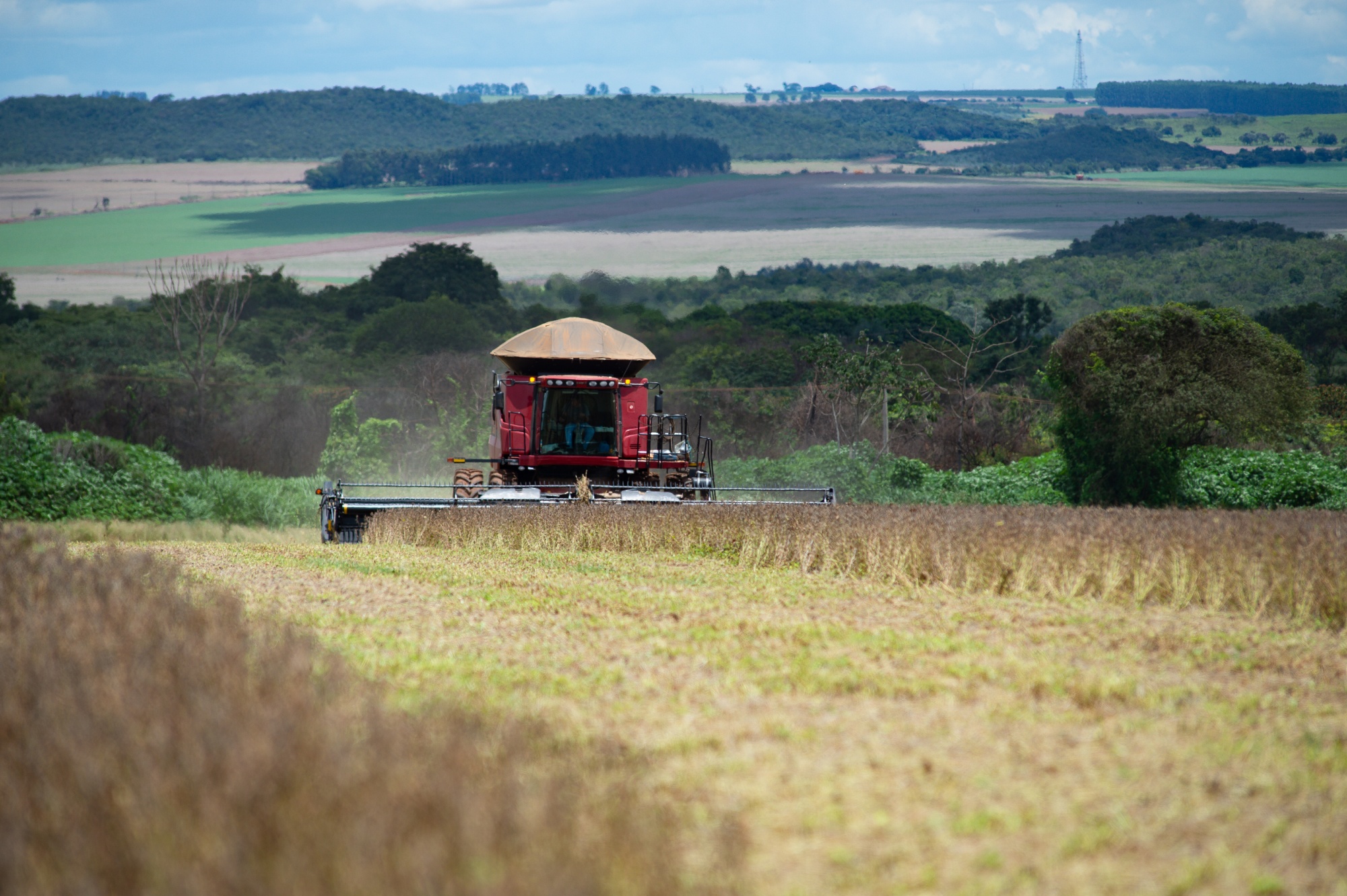 一台联合收割机在巴西利亚附近的农场收割大豆。