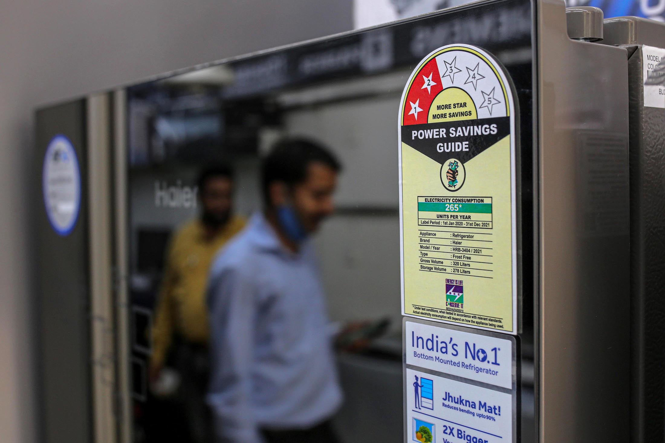 一个标签显示了孟买商店里一台冰箱的能效等级。摄影师:Dhiraj Singh/Bloomberg
